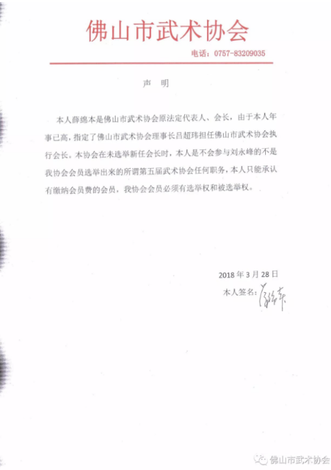 作为中国唯一一座“武术之城”,佛山市武术协会自去年5月换届并选举刘永峰为第五届会长后,一直陷于原协会个别协会领导与新一届协会的纷争之中,原协会主席薛绵本于今年3月发表的一份关于“不会参与刘永峰的所谓第五届武术协会任何职务”的声明(见下图),更是将这一矛盾公开化。