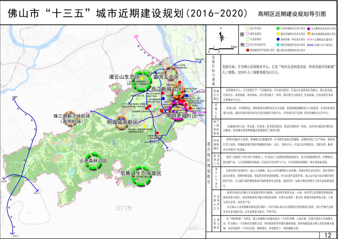 根据《近期规划》,佛山市范围内近期划定9处重点开发建设地区,分别为:佛山市禅南顺(三龙湾)高端创新集聚区、禅西新城(禅城)、佛山西站枢纽片区/粤桂黔高铁经济带合作试验区广东园(南海)、广东金融高新技术服务C区、南山片军民融合产业区(南海、三水)、杏坛军民融合发展创新实验区(顺德)、西江新城(高明)、珠三角新干线机场(高明)和三水新城(三水)。高明以西江新城和珠三角新干线机场,占据其中的两席。