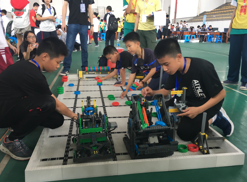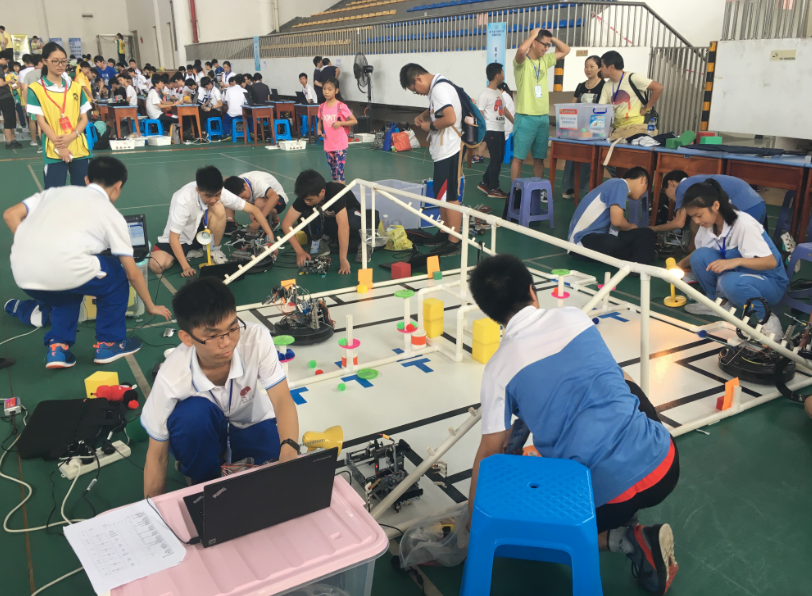 今年广东省中小学电脑机器人活动实体机器人竞赛共有16个竞赛项目,包括机器人灭火、人型机器人全能挑战赛、WER能力挑战赛、FLL工程挑战赛等项目。通过竞赛让学生之间能相互学习、相互借鉴,进一步提升学生的科学探索精神和科学探索能力,锻炼学生的创新思维。全省20个地级市选拔推荐的417支代表队,858名学生和329名指导教师参加超级轨迹、创意闯关、人形机器人全能挑战等16个项目的比赛。另有来自10个地市58名中小学创客小达人组成的29支参赛团队参加创客现场賽。参赛选手现场进行创意比拼,展现编程能力、硬件使用能力、工具规范使用能力、团队的合作精神以及创新思维。