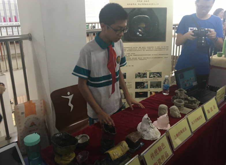 石湾三小展出了2016年获广东省中小学创客大赛一等奖作品名称《独一无二陶瓷器皿颜色》,主要特点,在传统的陶瓷器皿制造的基础上作一次创新,从制作到成品,从固定颜色到不可预测颜色,都作了创新,体现了从传统工艺到多学科融合的创新。