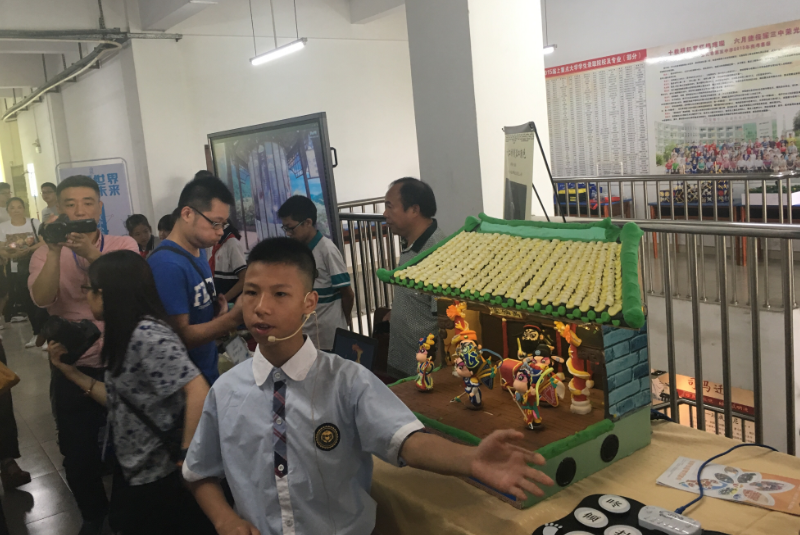 佛山市禅城区澜石小学的创客作品“创意彩泥--粤剧体验平台”融合音乐、美术、语文、信息技术等学科,加入科技以及文化元素,不同角色的粤剧公仔的身体会随着乐曲摆动,并带动舞台上的灯光亮起来,让优秀的粤剧文化更加立体灵动。