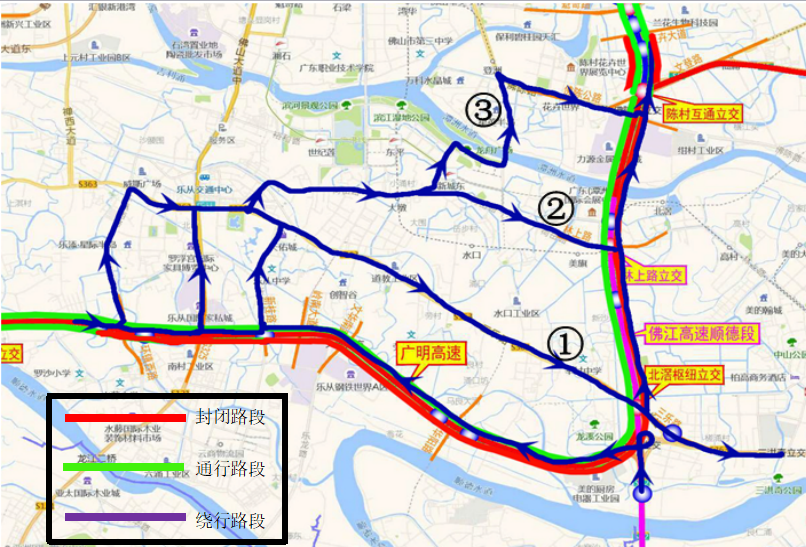 1、佛山一环南线(环镇西路出口)→辅道→环镇西路(利用S121、新桂路分流)→三乐路→辅线→佛陈路