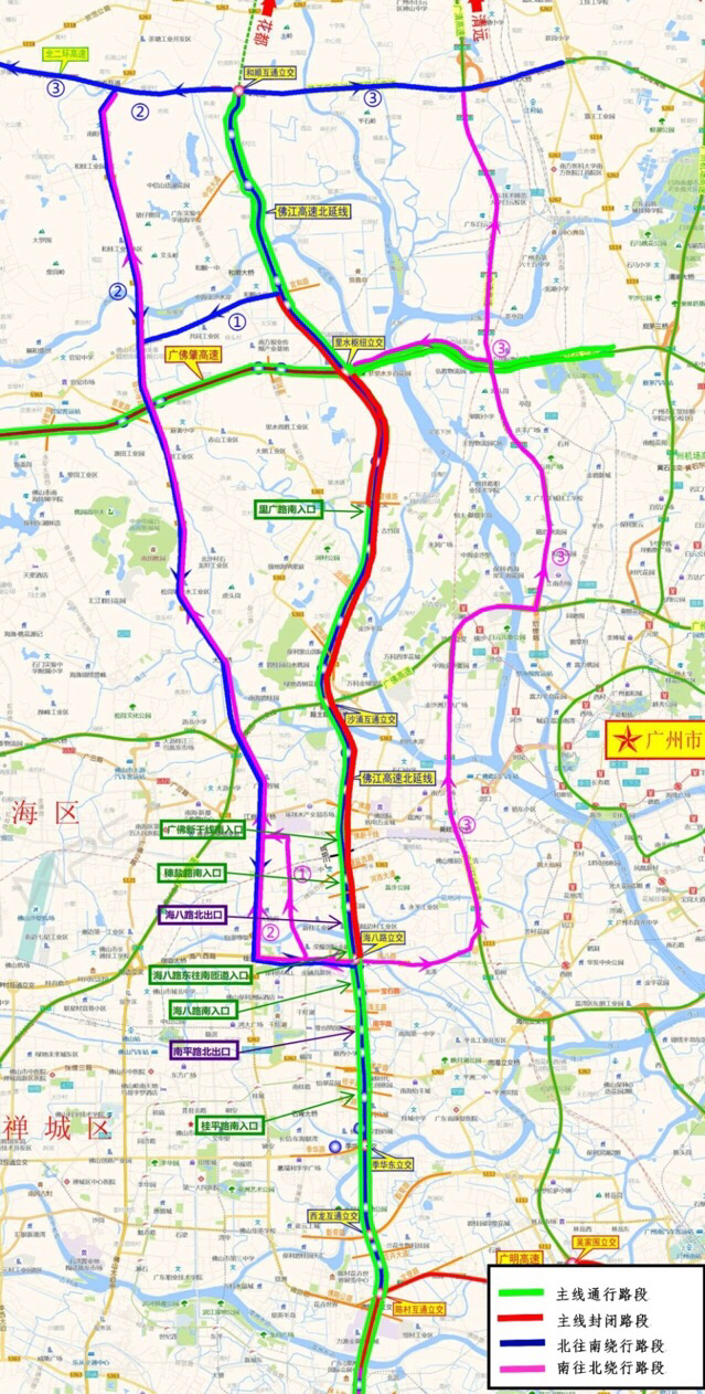 解封路段共设置8个临时出入口,分别为:里广路南入口、广佛新干线南入口、穗盐路南入口、海八路北出口、海八路东往南匝道入口、海八路南入口、南平路北出口、桂平路南入口。