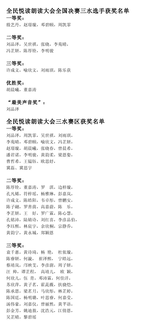 据悉,全民悦读三水阅读会从今年5月20日始全面铺开三水区的报名工作以来,得到了三水广大朗读爱好者的积极参与,在报名的255名选手中,经过海选与复选,有93名选手分别获得了三水赛区的一、二、三等奖。经过层层选拔,有17名选手代表三水赛区赴北京参加8月19日-21日的全国半决赛与决赛,捧回18个奖项。