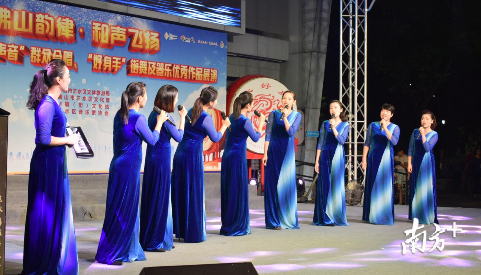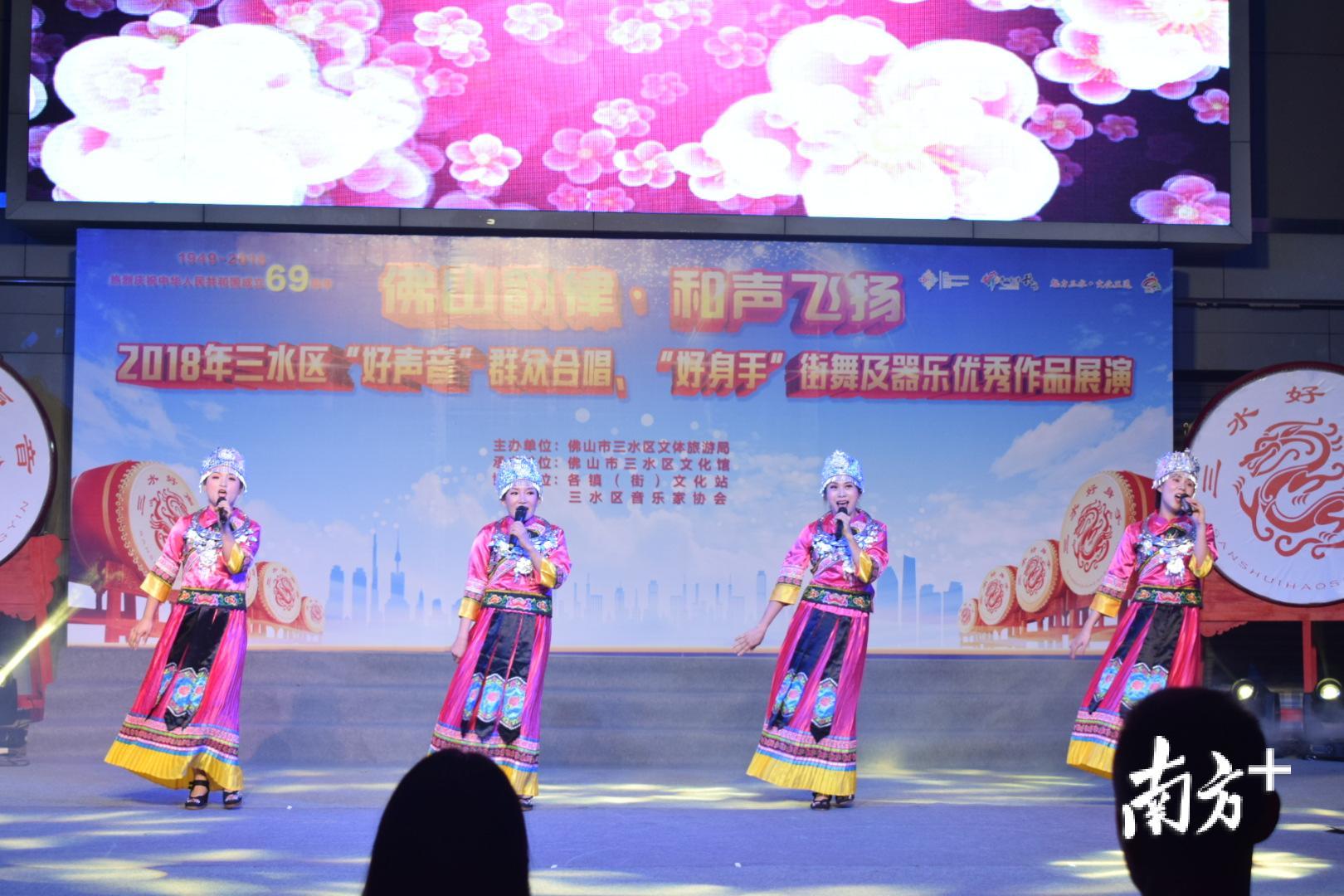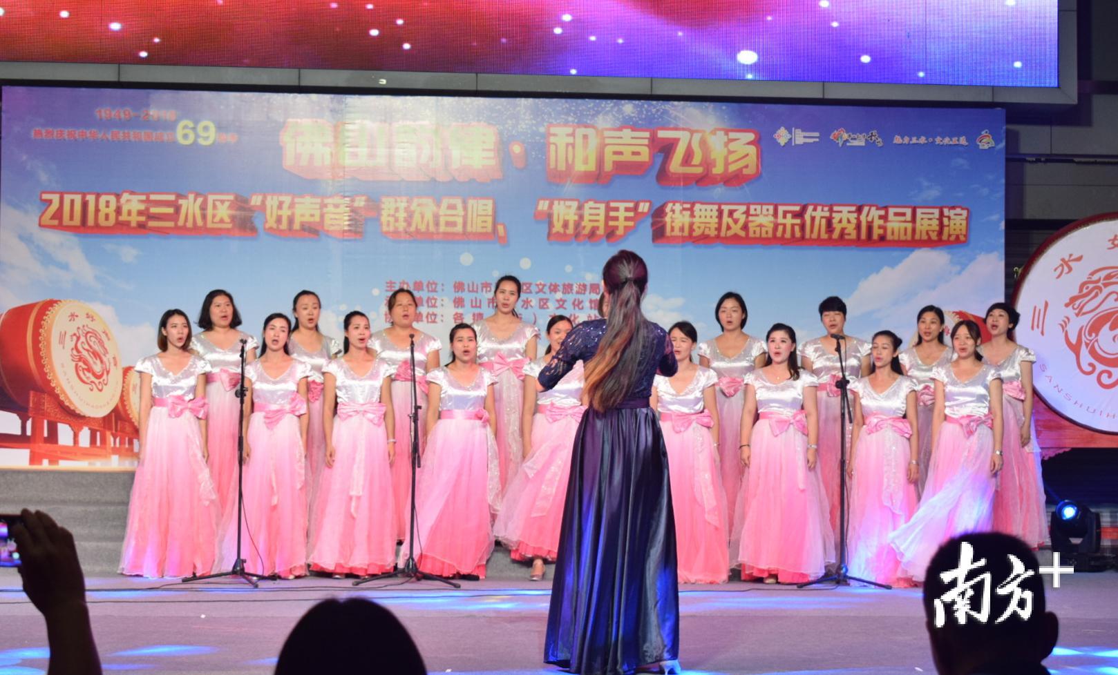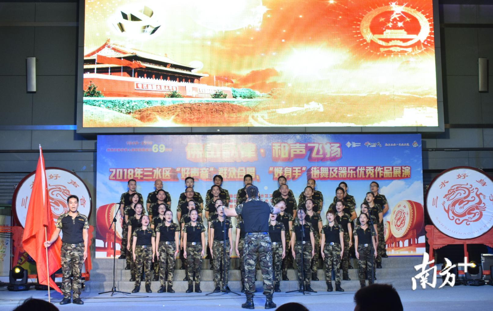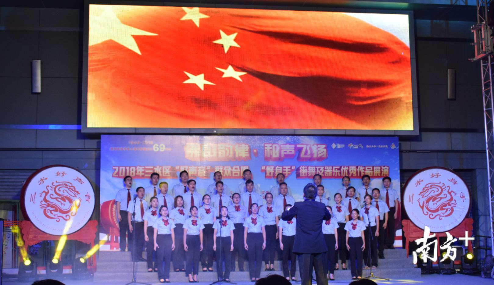 9月29日晚,“佛山韵律·和声飞扬”——2018年三水区“好声音”群众合唱、“好身手”街舞及器乐优秀作品展演活动在三水区文化馆小广场举行,来自各镇街的14支队伍以合唱、街舞、器乐合奏等形式献礼国庆佳节。