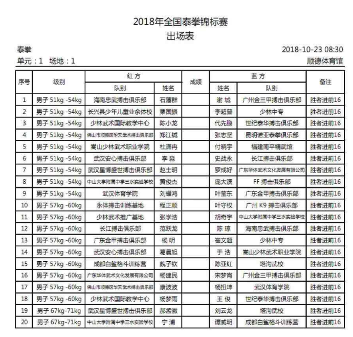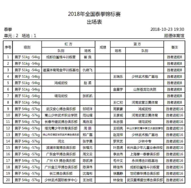 以下是2018年全国泰拳锦标赛出场表↓