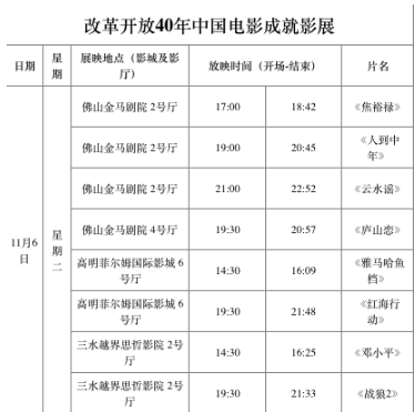 为庆祝改革开放40年,展现中国电影的巨大成就,本次金鸡百花电影节将于11月10日下午14:30在佛山金马影剧院举行改革开放40年中国电影成就影展活动,旨在通过电影回顾改革开放40年的伟大历程,突出中国改革开放的伟大成就,增加民族自信,激励民族精神。