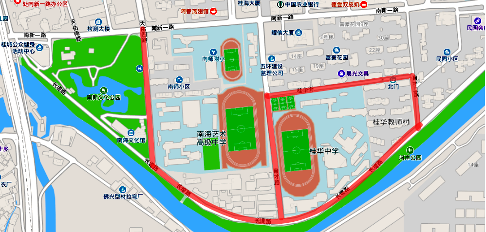 5、教师村后面(即东南角)沿河提至南海师范附属幼儿园大门的南端之间禁鸣喇叭。