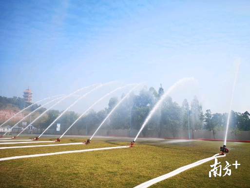 现场可见,远程供水车由泵浦车和水带车组成。演练现场已铺设好300米水带,泵浦车从三水区消防大队内侧水池泵水,将水快速输送到300米外消防车。只见一声令下,随着泵浦车发动,几秒内300米外的8门大水炮齐发,水柱冲天。