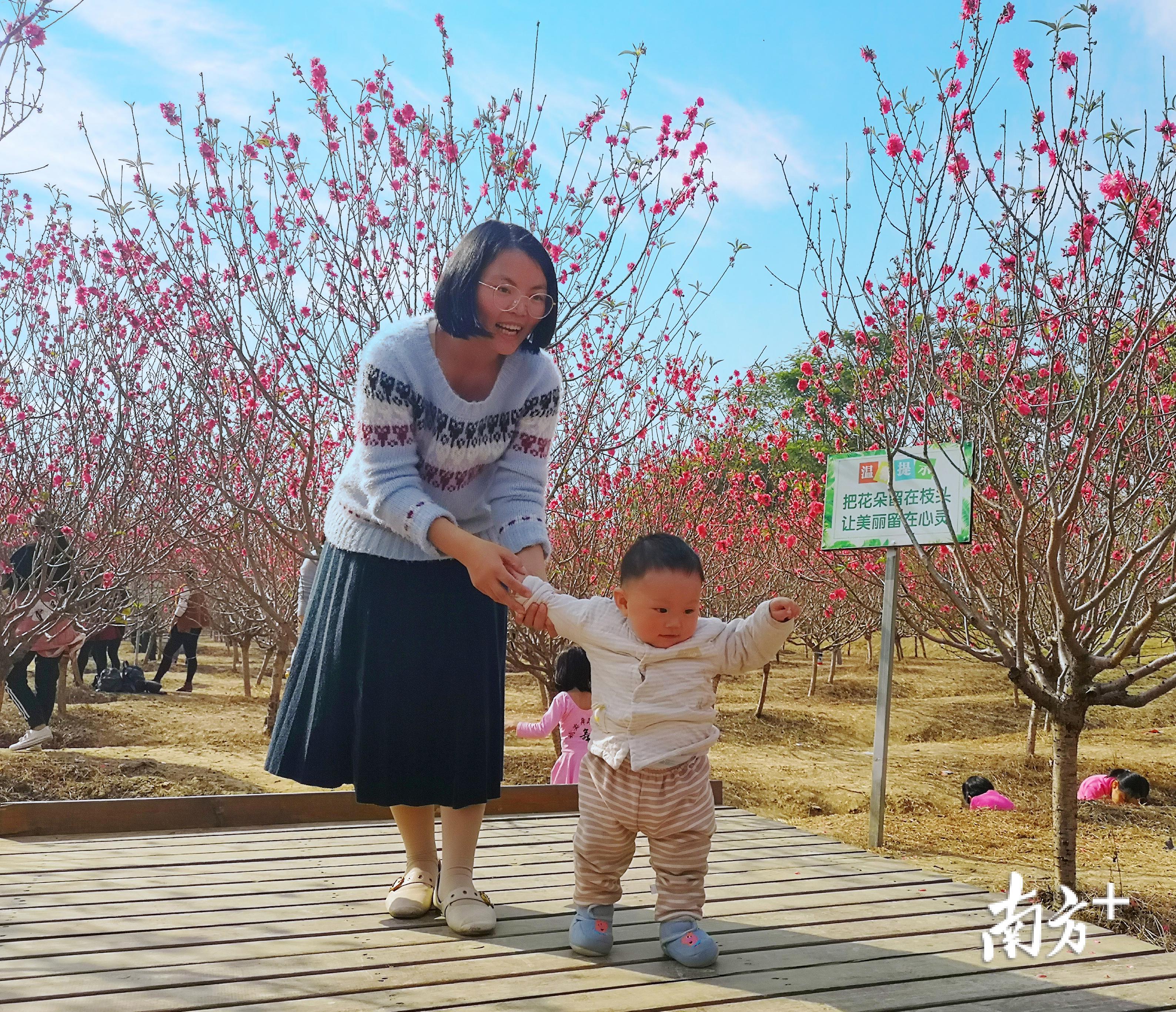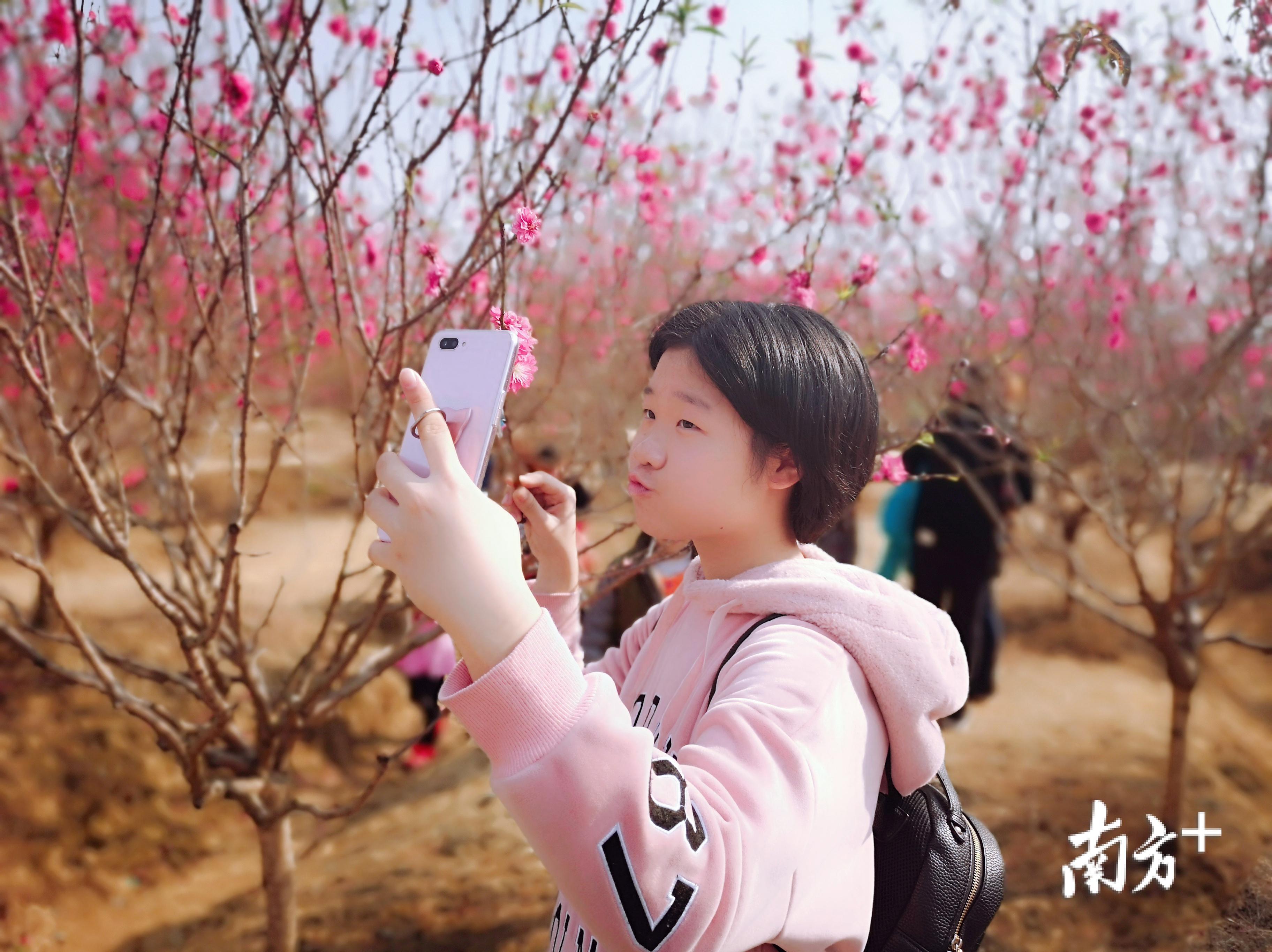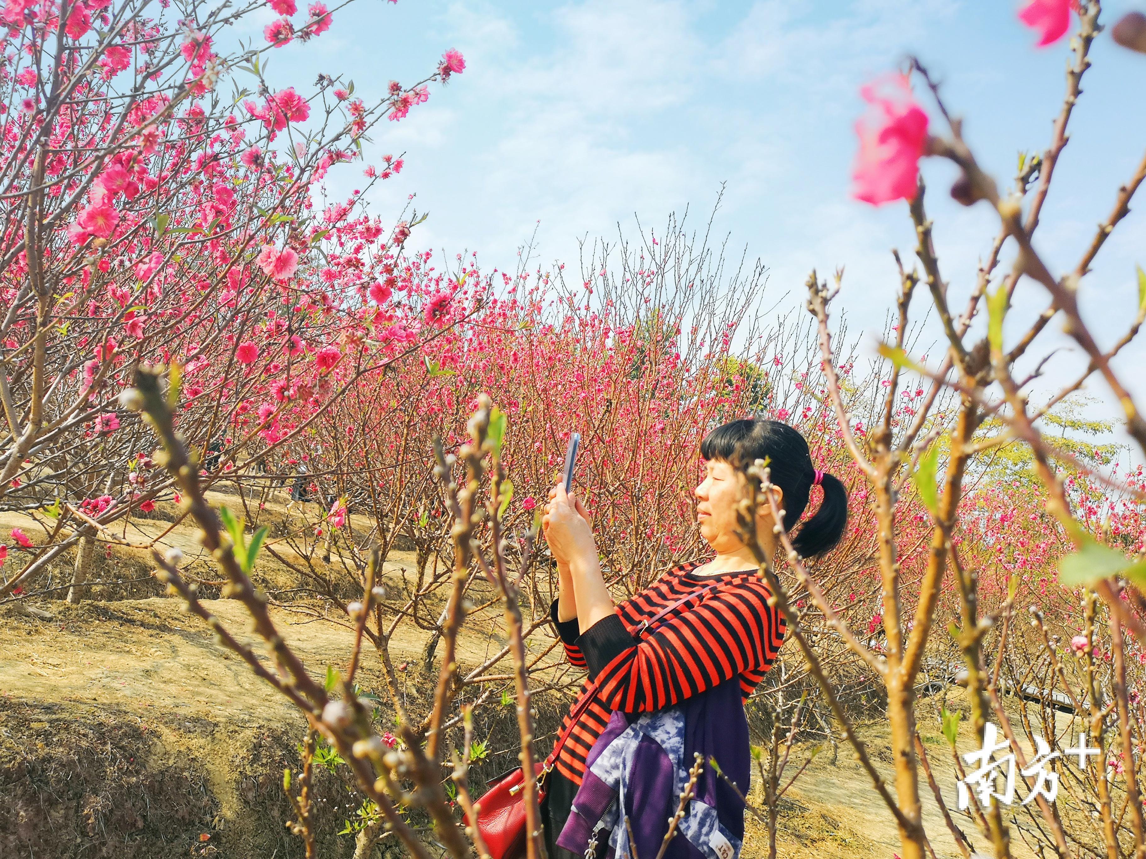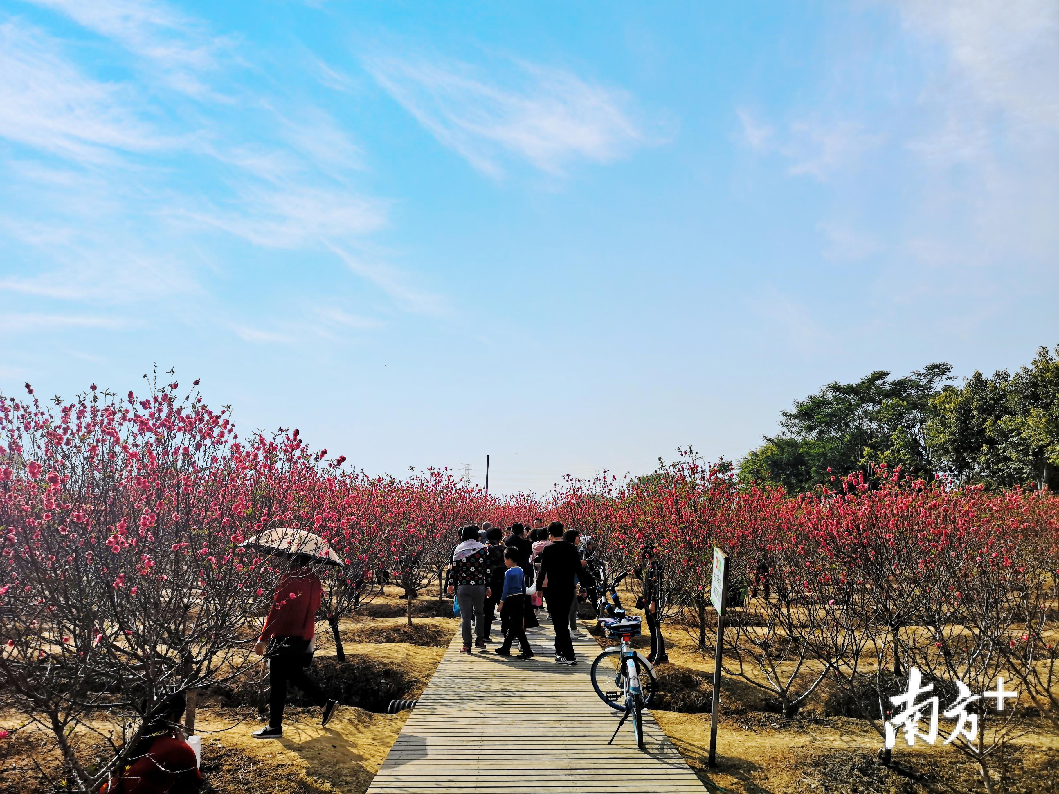 桃花灼灼,游客纷至沓来。1月27日,恰逢周末,到三水北江凤凰公园赏花的人更多了。