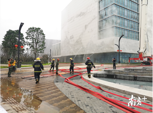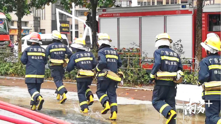佛山市三水区某大型城市综合体大楼浓烟滚滚,3名男子被困室内,正请求救援。随着一阵阵警笛声,多辆红色消防车迅速赶到,消防队员穿戴好设备乘上云梯,迅速灭火并救下被困人员。