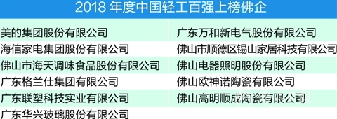 海信家电集团股份有限公司排名第5位,广东联塑科技实业有限公司排名第7位,佛山市海天调味食品股份有限公司排名第15位,广东格兰仕集团有限公司排名第18位,佛山佛塑科技集团股份有限公司排名第47位,佛山欧神诺陶瓷有限公司排名第69位,广东星联精密机械有限公司排名第83位,广东万和新电气股份有限公司排名第87位