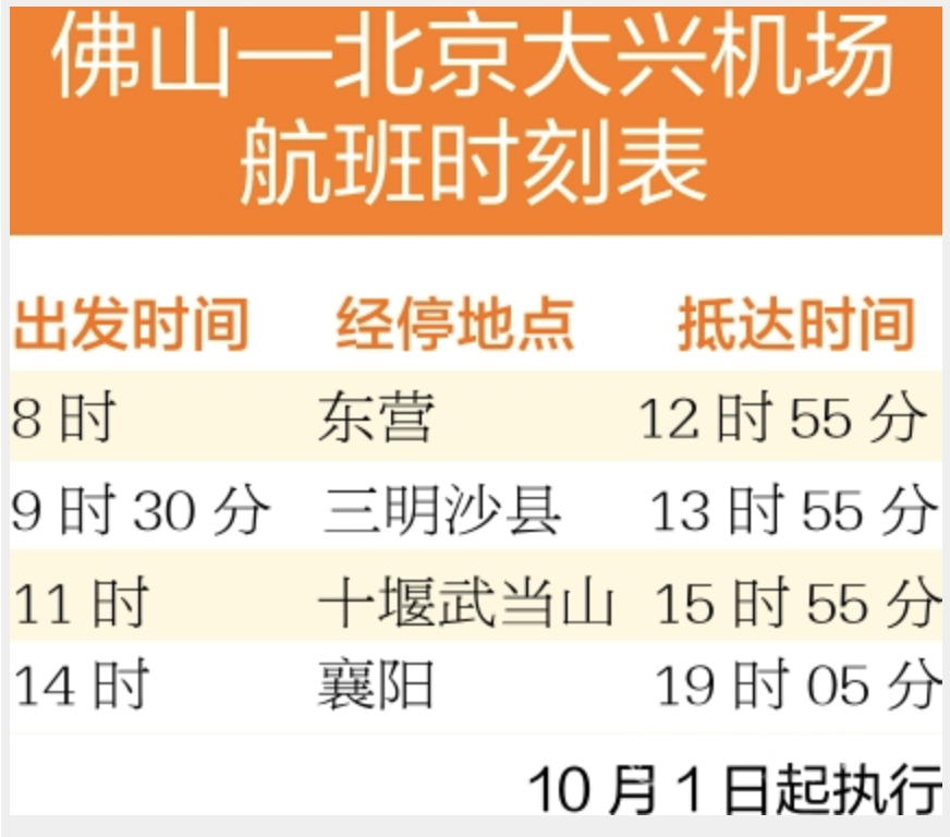 9月30日当天,佛山飞往北京的航班目的地将改为大兴机场。当天,中联航仅安排了两个航班飞往北京,最早航班为8时出发,经停东营,于12时55分抵达大兴机场,而另一个航班则安排在14时出发,经停襄阳,在19时05分抵达大兴机场。可以说,一早一晚两个航班与原来的出发和抵达时间一样。