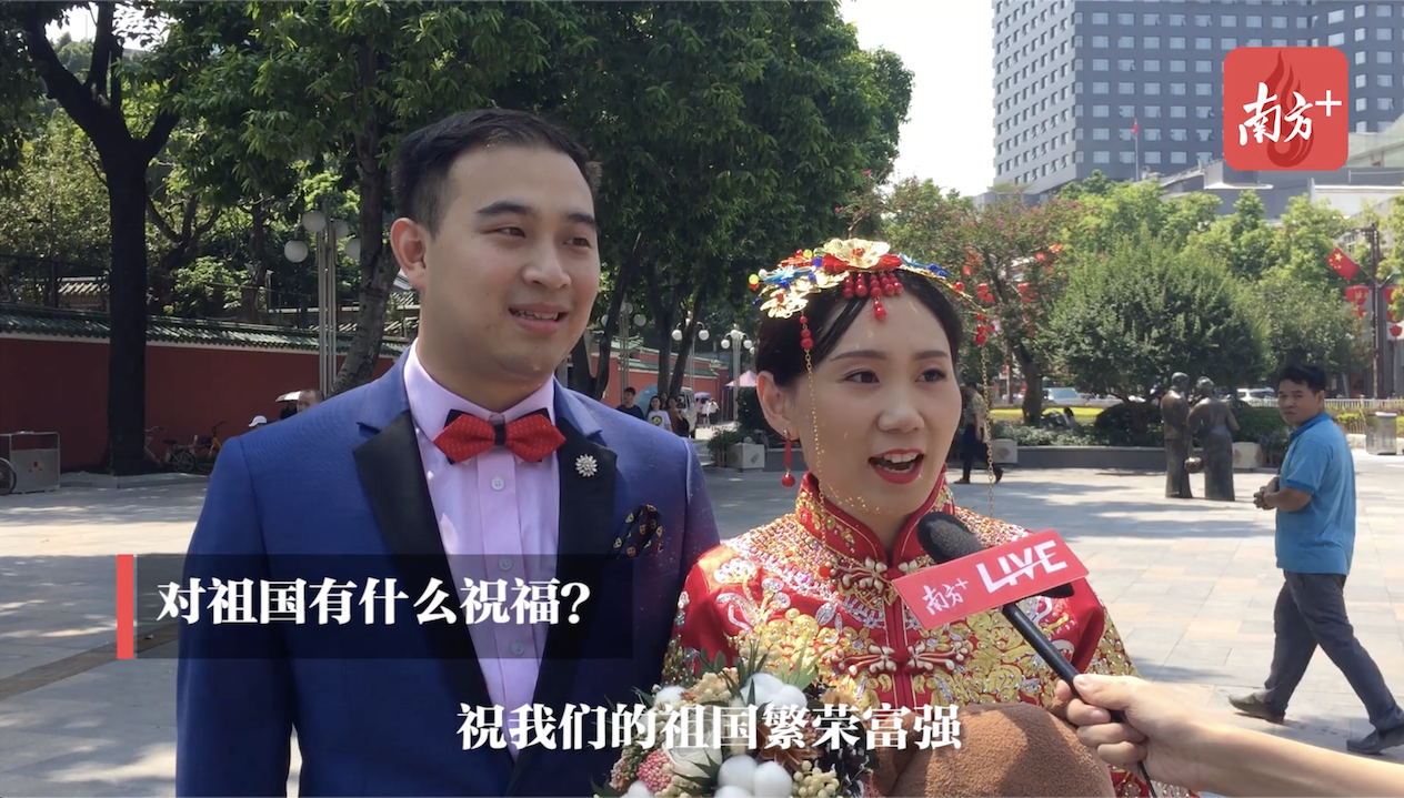 “我们结婚啦!”刚领完结婚证,一对新人带着摄影师来到祖庙门口开启拍照模式,记录甜蜜瞬间。“以后每年的国庆假期也是我们的结婚纪念假期。”他们说。