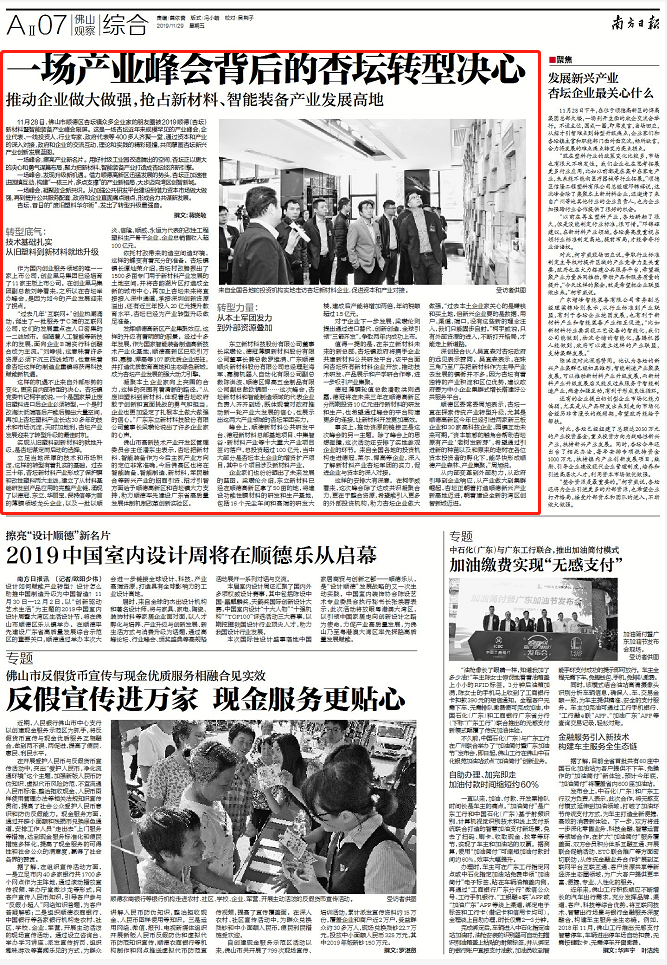 11月28日,佛山市顺德区杏坛镇众多企业家的朋友圈被2019顺德(杏坛)新材料暨智能装备产业峰会刷屏。这是一场杏坛近年来规模罕见的产业峰会,企业代表、一线投资人、行业专家、政府代表等400多人齐聚一堂,通过资本和产业的深入对接,政府和企业的交流互动,理论和实践的精彩碰撞,共同擘画杏坛新兴产业创新发展蓝图。