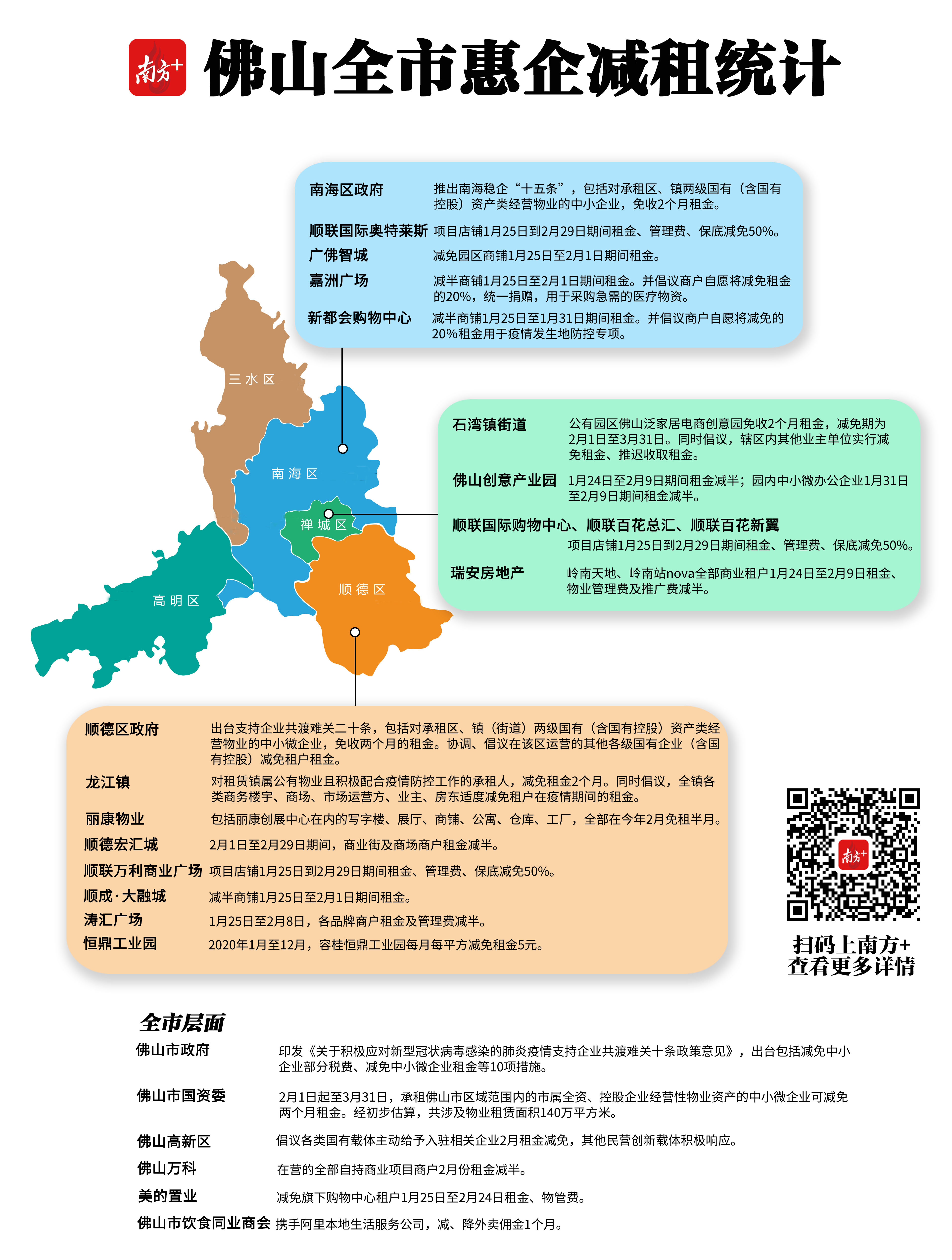 南方+制作了佛山抗疫惠企减免租金地图,分区域盘点各减租主体的政策,读者可以一一查阅。