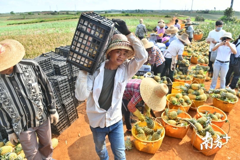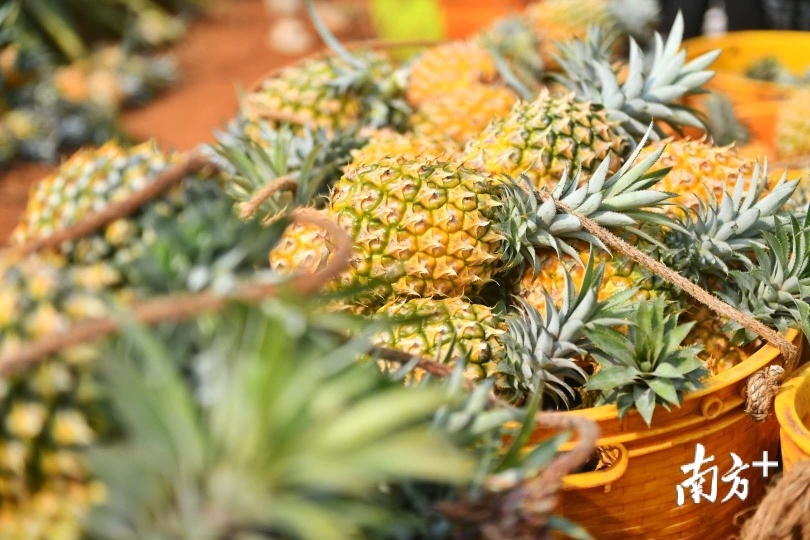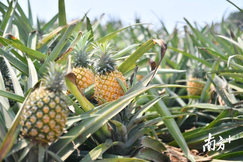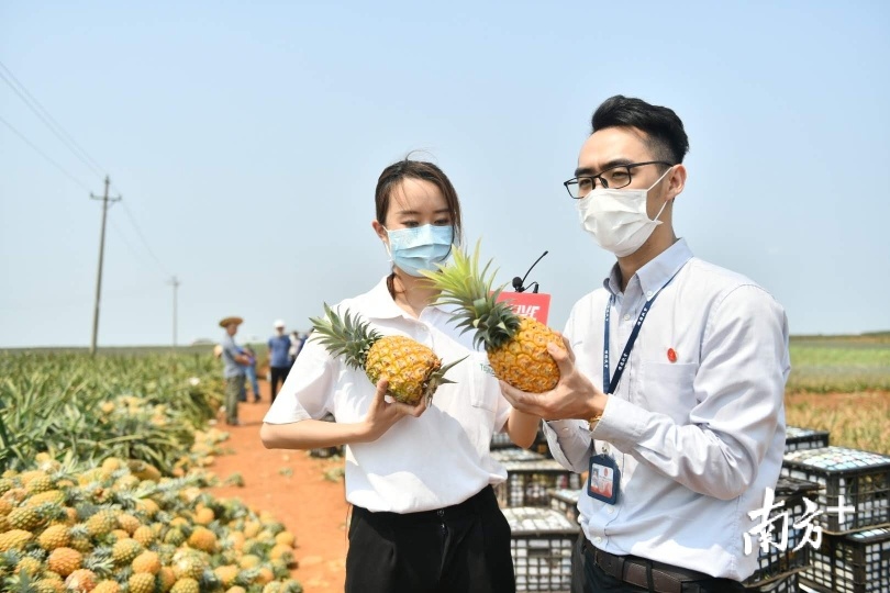 在全国最大的菠萝生产区——湛江徐闻,南方+直播主持人和来自佛山市顺德区民政和人力资源社会保障局、派驻当地的湛江市徐闻县那板村第一书记梁力,一起为当地甜美多汁的优质菠萝直播带货。这批菠萝已在南方优品平台上线,据南方优品相关负责人透露,截至12时直播结束时,已有近2万斤菠萝下单。