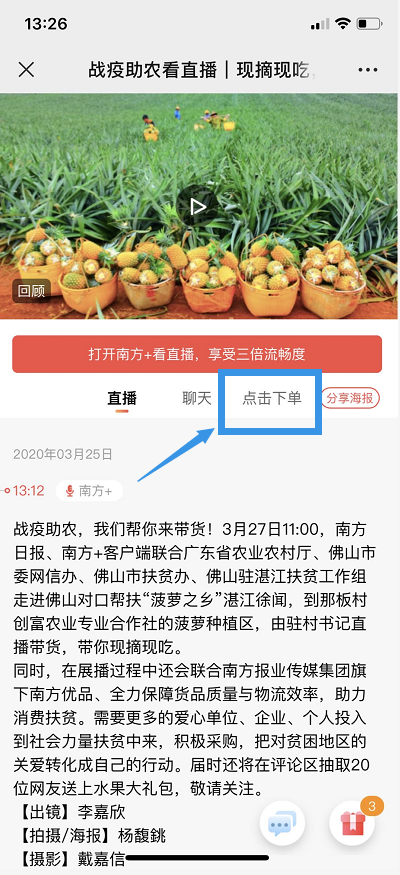 第二步:点击直播页面“点击下单”按钮即可按提示购买。珠三角区域内可包邮到家。