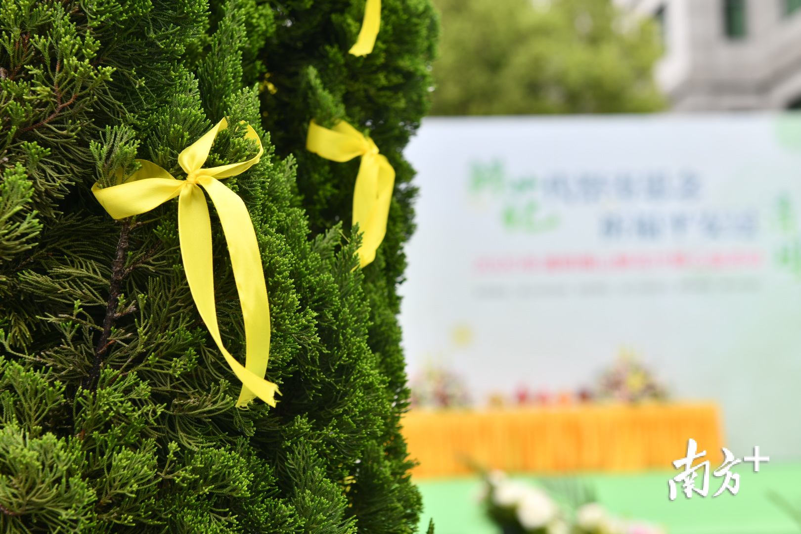 简短而又严肃的敬献花束的环节结束后,工作人员前往无烟祭祀区为逝者进行祈福追思。他们把一条条黄色的丝带绑在桂花树上,借此把一份份思念与期盼也寄给先人。