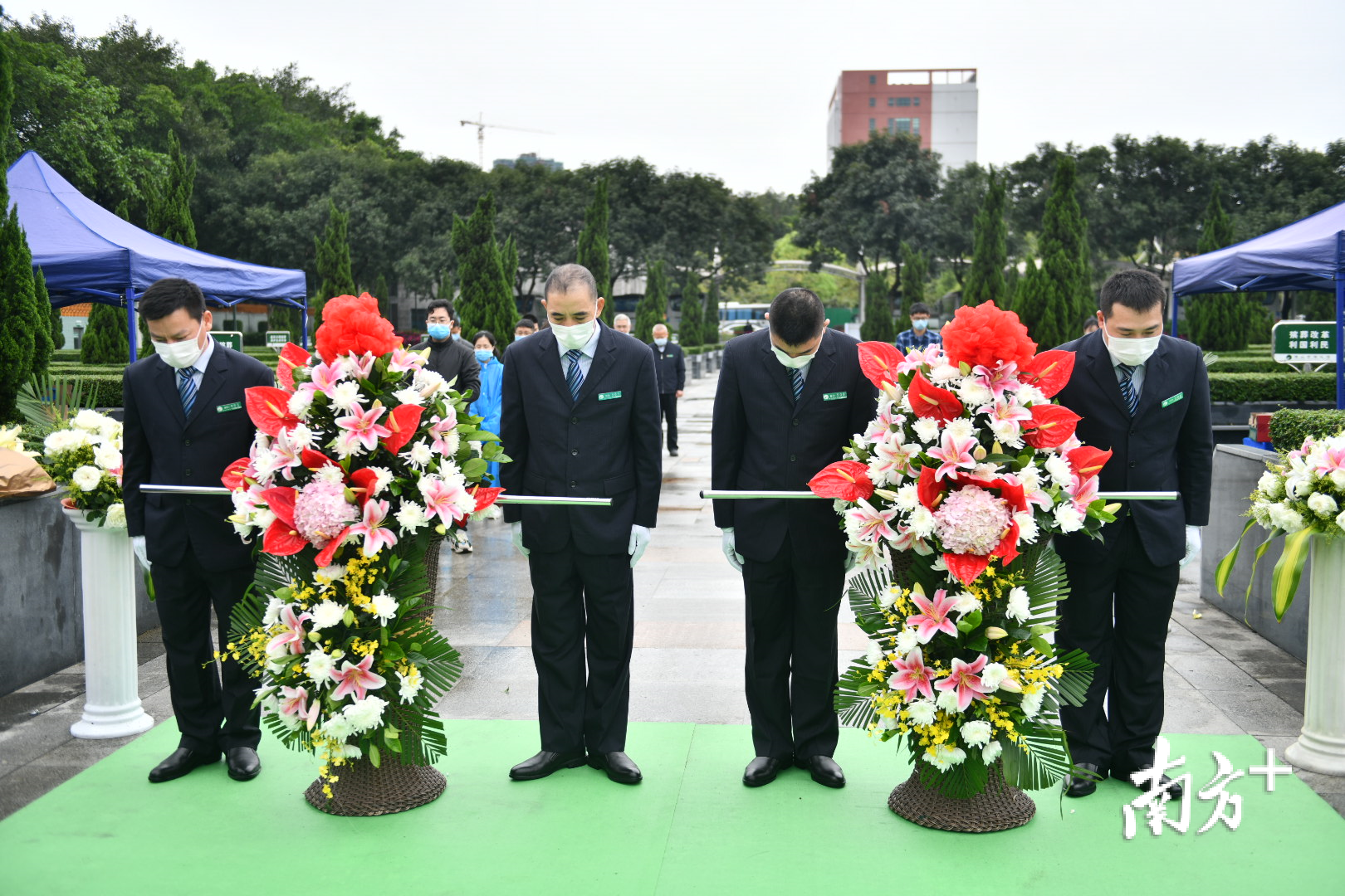 4月4日,正清日。佛山市民政局组织开展鲜花代祭公益活动,以工作人员集体代献鲜花的方式,为无法前来现场祭扫的市民寄托哀思。