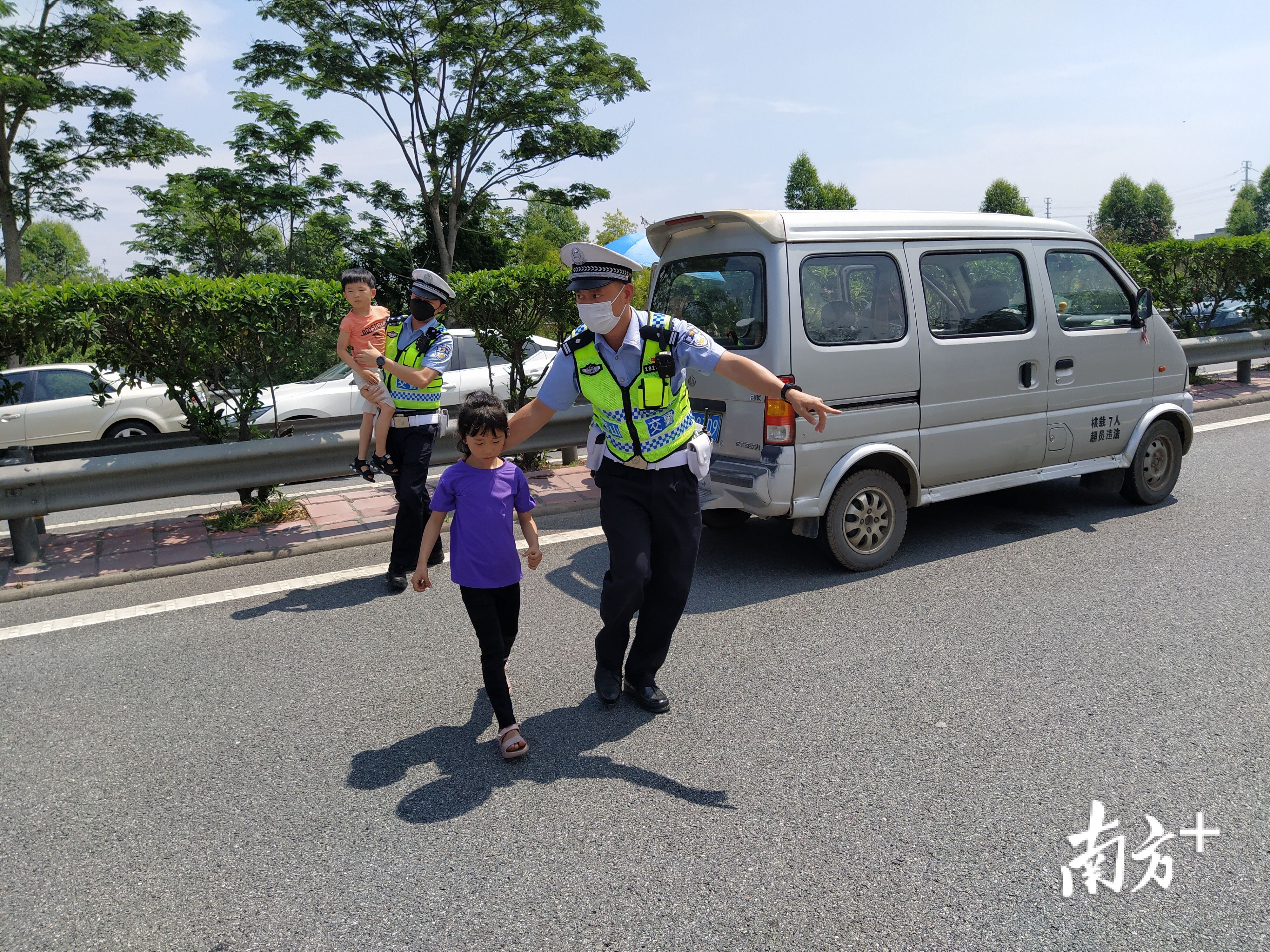 图2:5月4日上午,佛山市公安局交警支队执勤民警在南二环发现一辆面包车因故障停在在超车道上。民警立即将车上乘客转移到安全的位置,并后帮助司机将故障车推到路肩,通知拯救队救援。