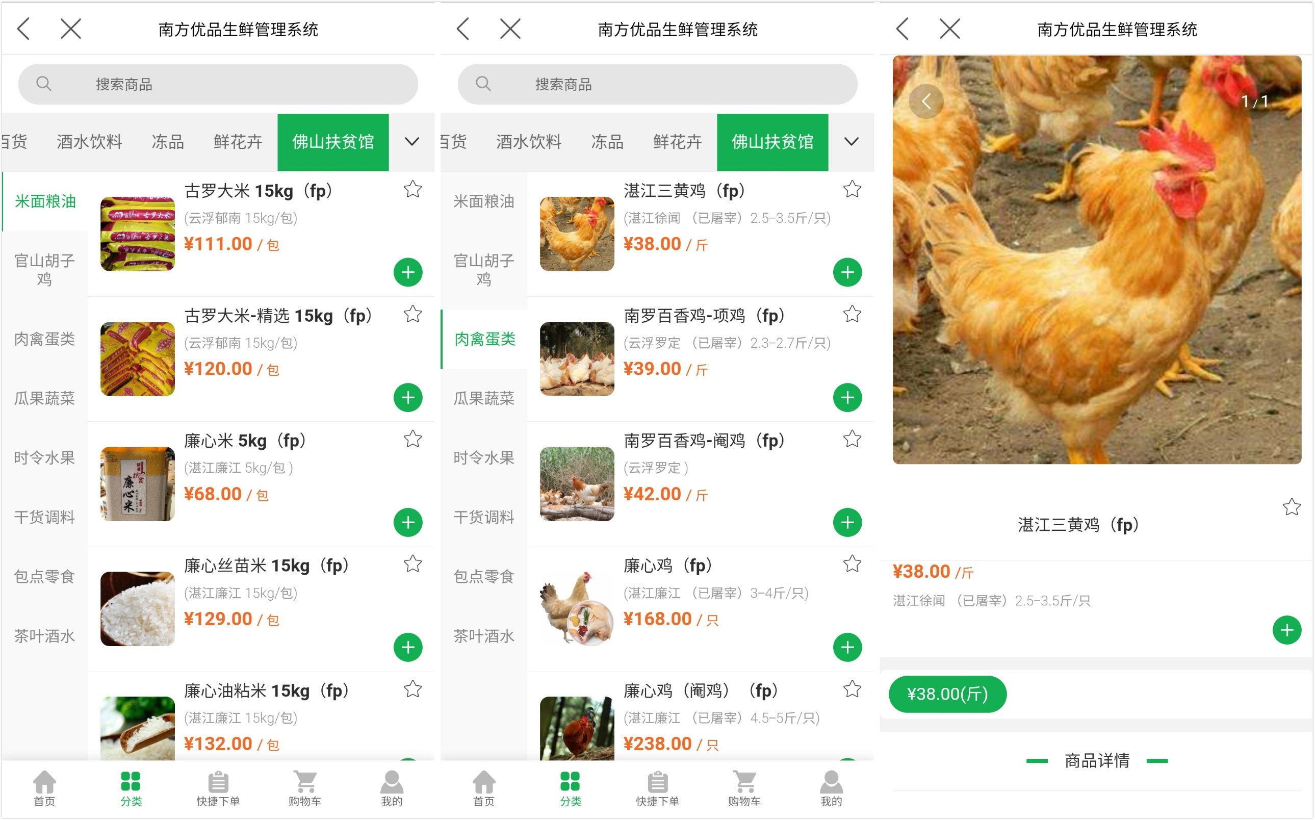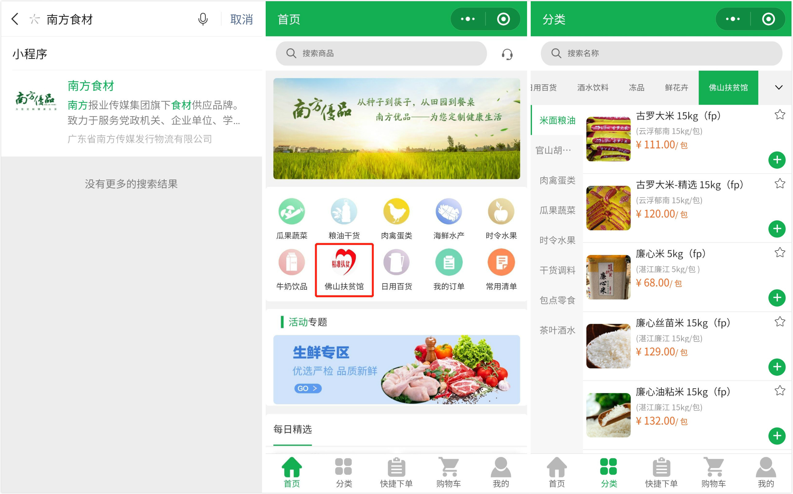 微信小程序搜索“南方食材”,即可看到红色标识的佛山扶贫馆,点击进入即可下单凉山、湛江、云浮的新鲜食材。