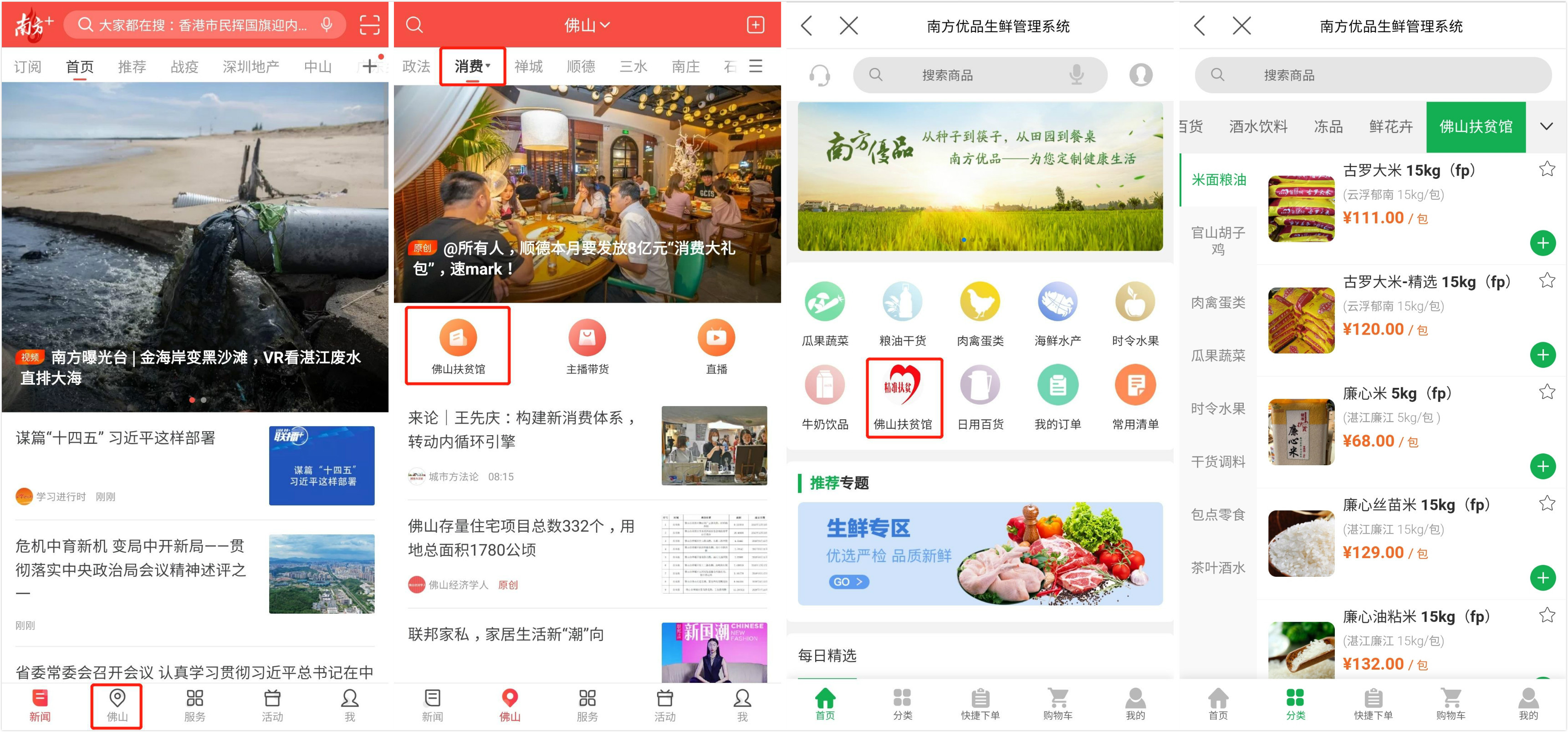②打开“南方+”客户端,在城市中选择佛山,找到消费频道,进入佛山扶贫馆;佛山地区用户可直接点击进入消费频道,进入佛山扶贫馆。