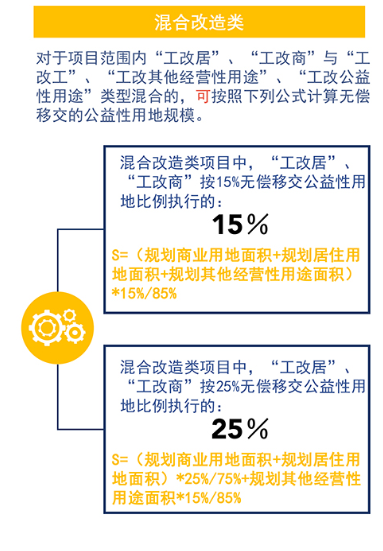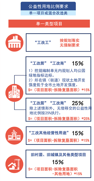 在现有公益性用地移交规定的基础上,进一步细分“现状工业改造为经营性开发项目”的无偿移交责任。考虑到养老院、私立学校等部分带有公益性质的经营性开发项目,因此,对于“工改居”“工改商”外的“工改其他经营性开发项目”,其公益性用地无偿移交的比例要求按15%执行即可。