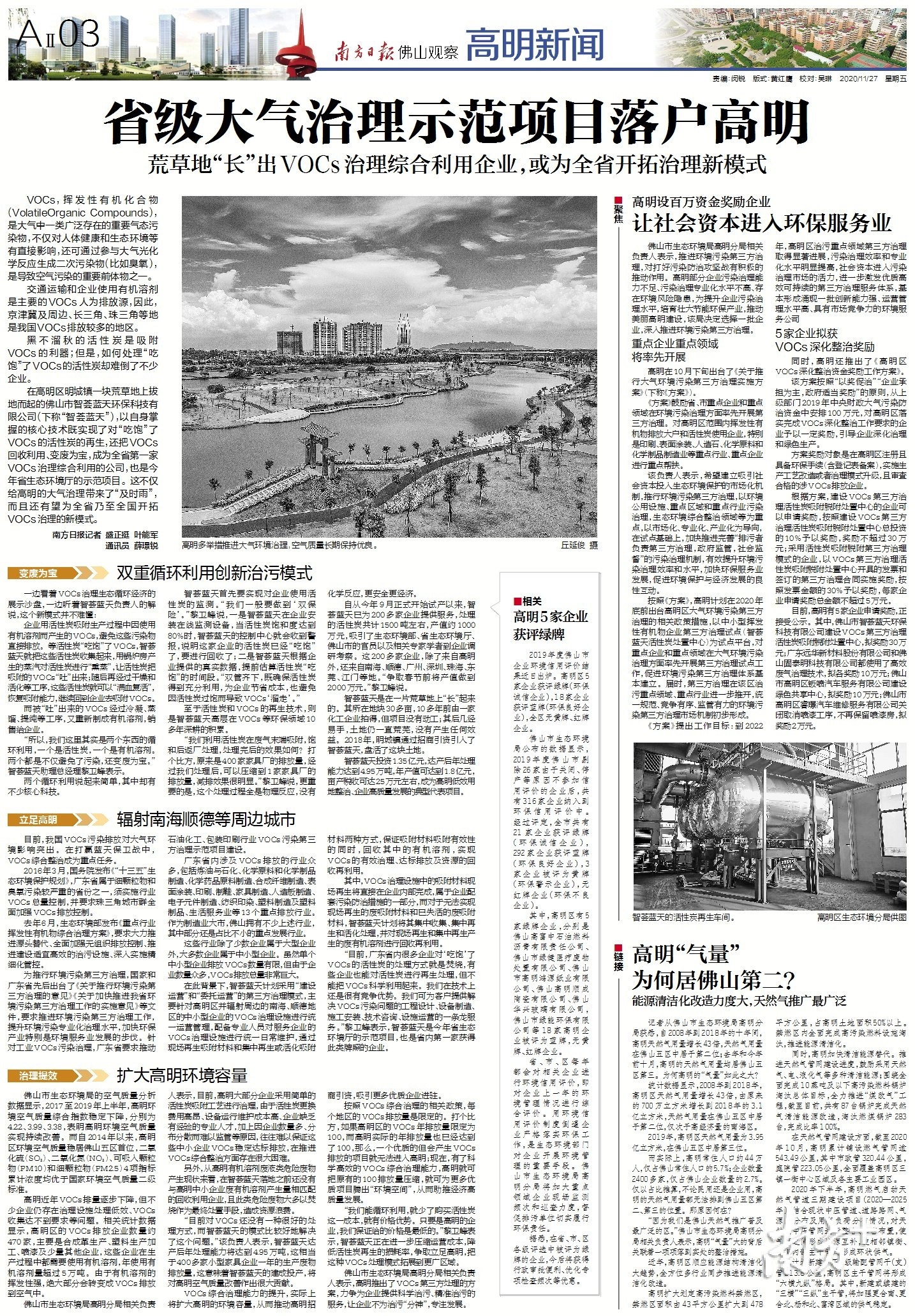 佛山市生态环境局高明分局相关负责人表示,高明推出了VOCs第三方处理的方案,力争为企业提供科学治污、精准治污的服务,让企业不为治污“分神”,专注发展。