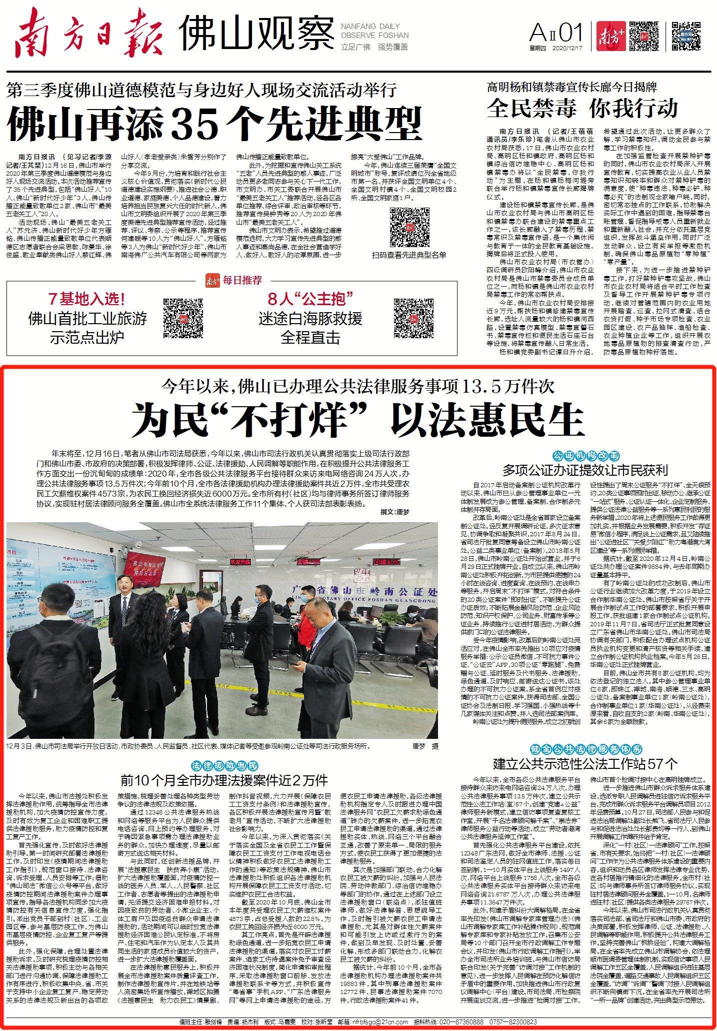 年末将至,12月16日,笔者从佛山市司法局获悉,今年以来,佛山市司法行政机关认真贯彻落实上级司法行政部门和佛山市委、市政府的决策部署,积极发挥律师、公证、法律援助、人民调解等职能作用,在积极提升公共法律服务工作方面交出一份沉甸甸的成绩单:2020年,全市各级公共法律服务平台接待群众来访来电网络咨询24万人次,办理公共法律服务事项13.5万件次;今年前10个月,全市各法律援助机构办理法律援助案件共近2万件,全市共受理农民工欠薪维权案件4573宗,为农民工挽回经济损失近6000万元。全市所有村(社区)均与律师事务所签订律师服务协议,实现驻村居法律顾问服务全覆盖。佛山市全系统法律服务工作11个集体、个人获司法部表彰表扬。