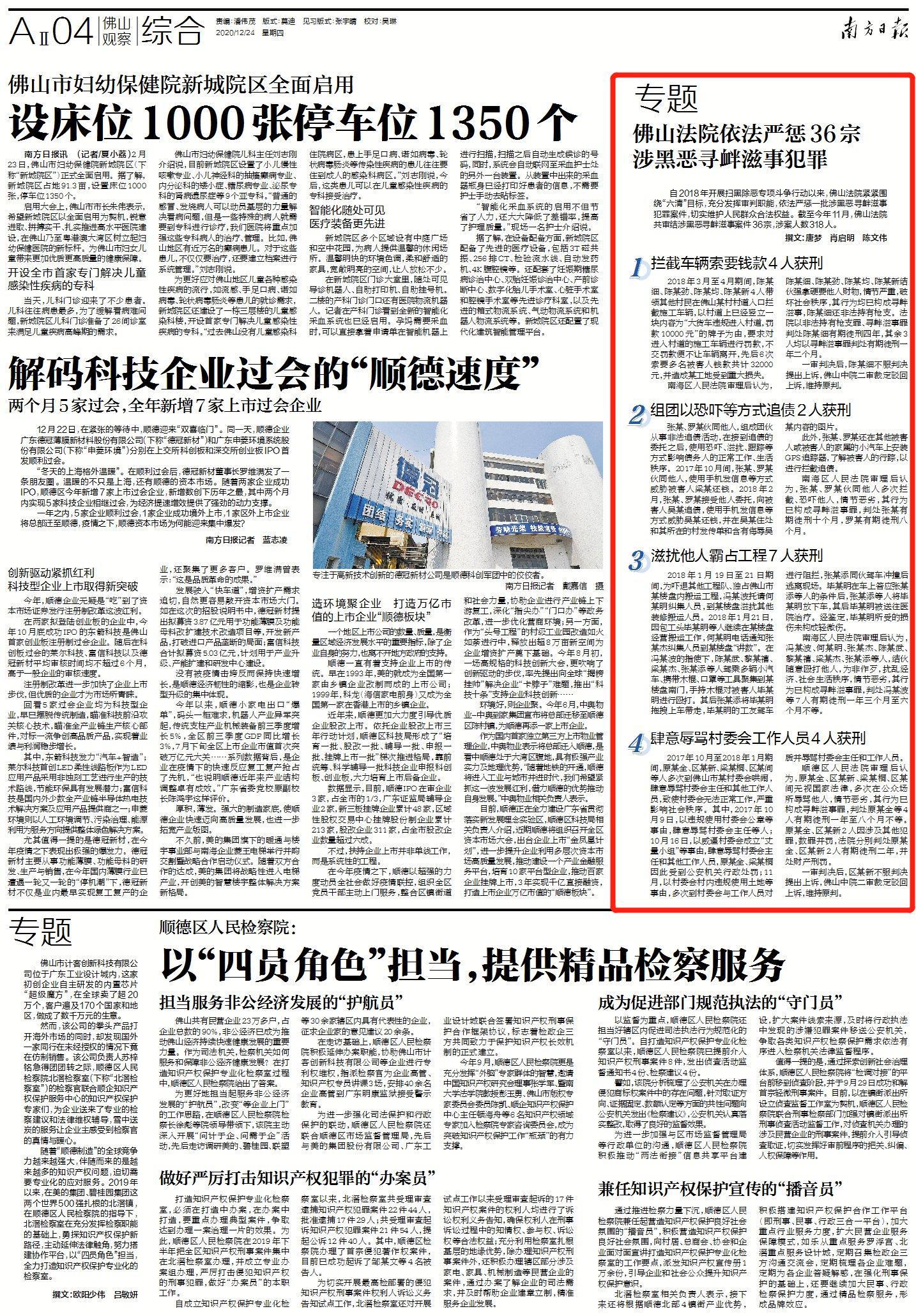 自2018年开展扫黑除恶专项斗争行动以来,佛山法院紧紧围绕“六清”目标,充分发挥审判职能,依法严惩一批涉黑恶寻衅滋事犯罪案件,切实维护人民群众合法权益。截至今年11月,佛山法院共审结涉黑恶寻衅滋事案件36宗,涉案人数318人。