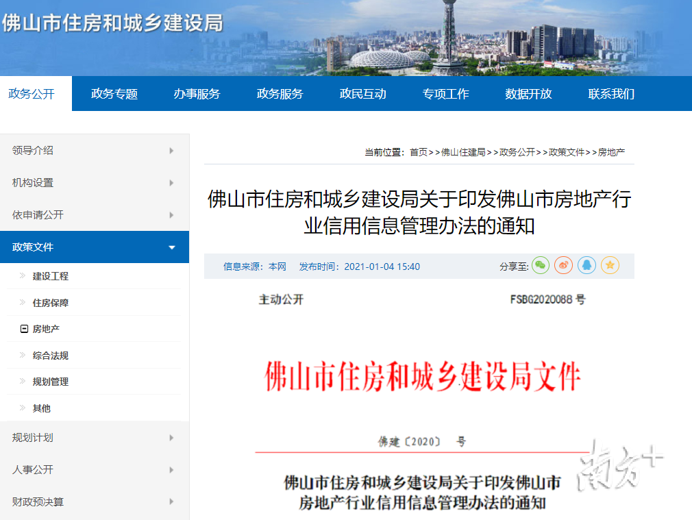 1月4日,佛山市住房和城乡建设局发布了关于印发《佛山市房地产行业信用信息管理办法》(下称“办法”)的通知。同时发布的政策解读强调,该办法是基于2015年原政策的修订更新,沿用原政策信用评价计分规则等6项精华,并就“红黑榜”纳入标准、“僵尸企业”信用评定办法等10个方面进行深化。