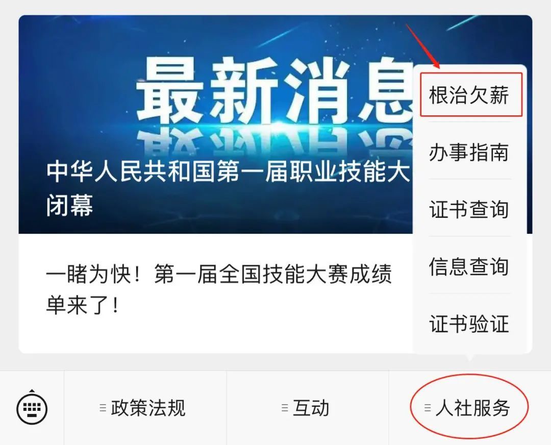 1、关注人力资源社会保障部微信公众号(微信号:rsbzwwx),在菜单栏“人社服务”栏目中选择“根治欠薪”;