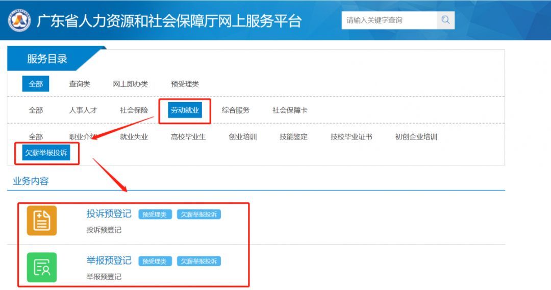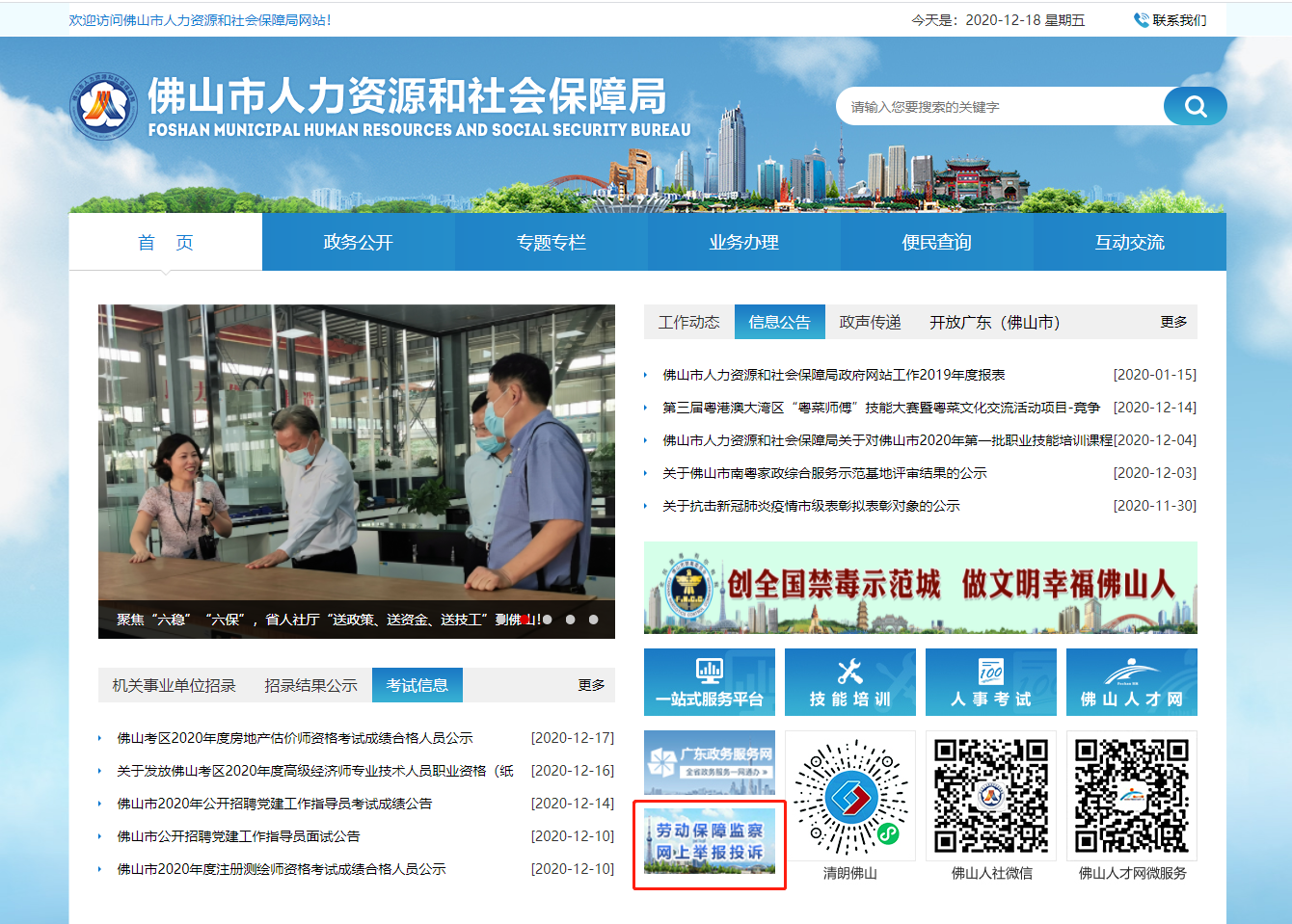 1、登陆网址http://hrss.foshan.gov.cn(佛山市人力资源和社会保障局官网主页面)点击页面最下方“劳动保障监察网上举报投诉”专栏进入广东省人力资源和社会保障厅网上服务平台,选择劳动就业→欠薪举报投诉,点击投诉登记或举报登记。