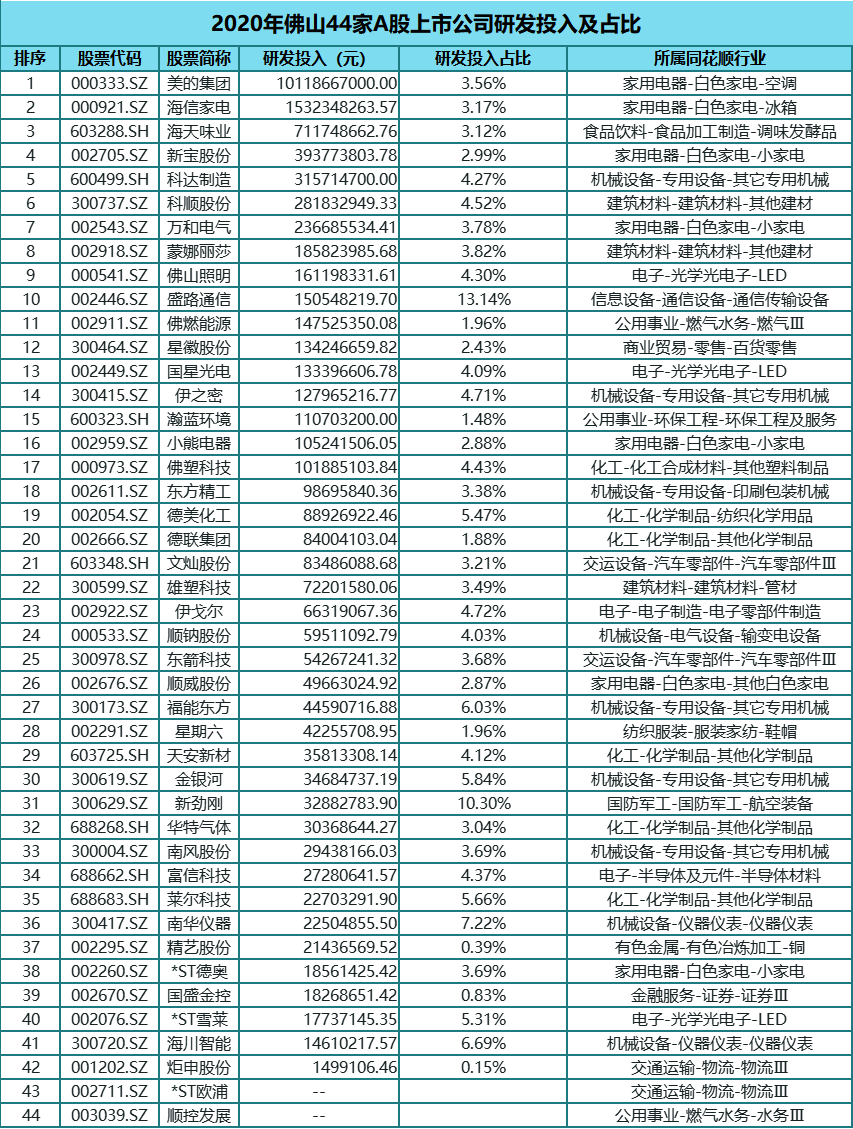 南方+记者梳理目前披露的佛山A股上市公司年报发现,2020年,佛山44家A股上市公司合计研发支出达到160.18亿元,相比2019年的146.16亿元增长了9.6%。其中,作为家电行业龙头,美的集团以超过百亿元研发支出成为佛山研发投入之冠,电子、军工、机械、化工行业则在研发占比上名列前茅。