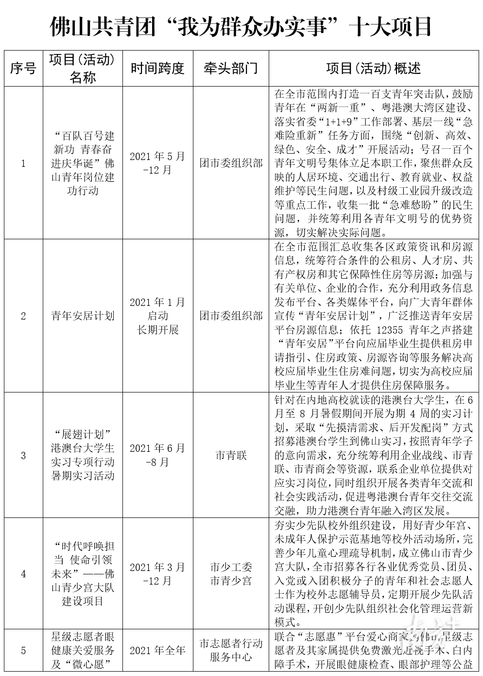 “我们在5月上旬从全市40个‘我为群众办实事’项目中,精选出佛山共青团‘我为群众办实事’十大项目,接下来就是完善常态化、长效化的项目信息报送及跟踪督导工作机制。”共青团佛山市委员会书记王树斌表示,召集广大志愿者加入佛山抗疫工作,就是近期团市委为民办实事的具体表现,5月28日到6月6日,全市参与核酸筛查志愿服务的志愿者共54816人(次),服务社区共655个,服务总时长328305小时。