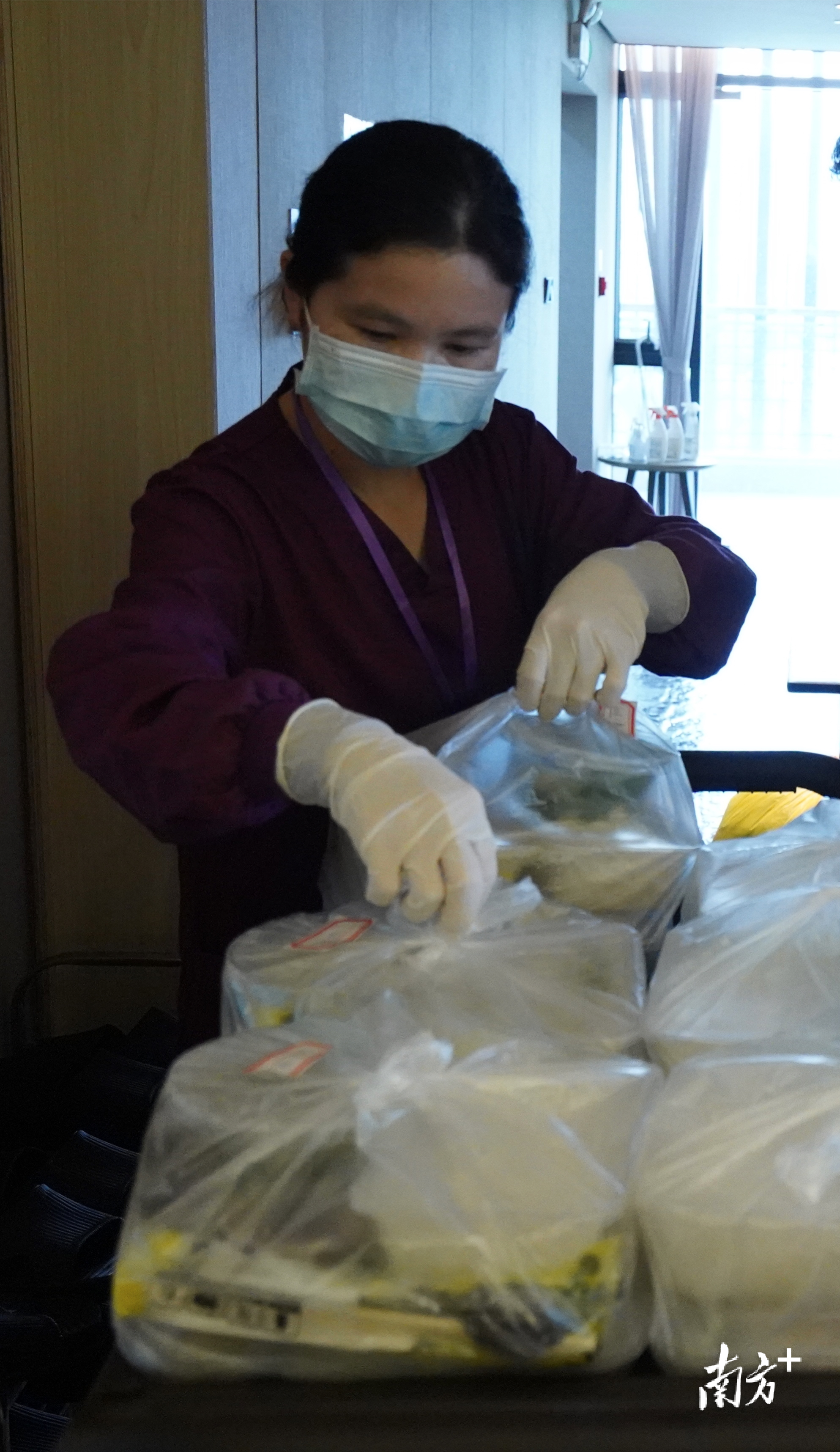 在南海区隔离酒店,隔离区与清洁区之间的半污染区内,医务人员正在再次检查送来的午餐是否全部密封好,是否按照客人的需求提供。