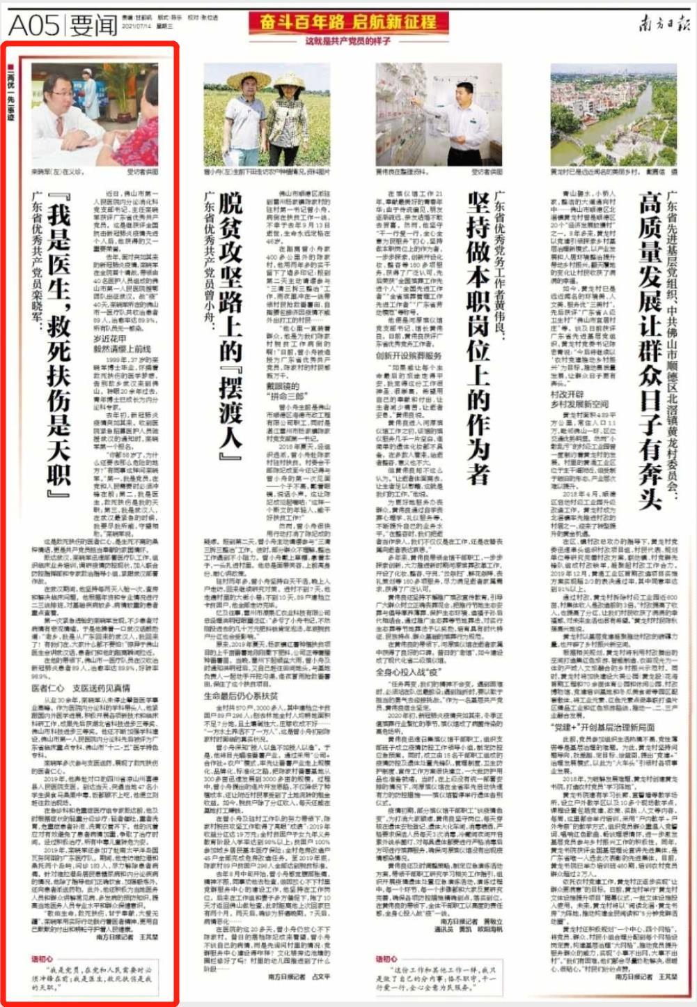 近日,佛山市第一人民医院内分泌消化科党支部书记、主任栾晓军获评广东省优秀共产党员。这是继获评全国抗击新冠肺炎疫情先进个人后,他获得的又一重要荣誉。