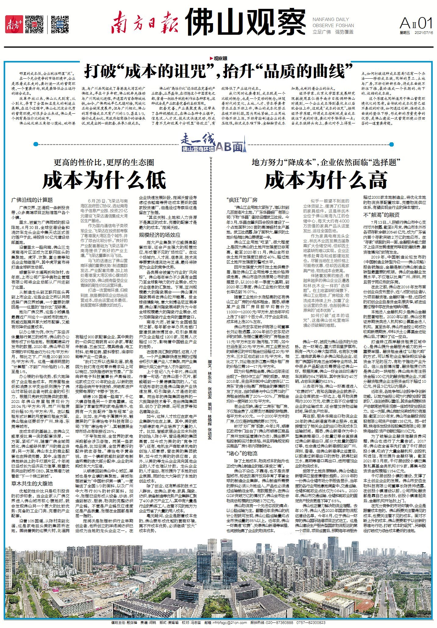 毫无疑问,企业是跟着成本走的,佛山要形成优越的营商环境,离不开成本优势,必须继续“放大”成本优势。