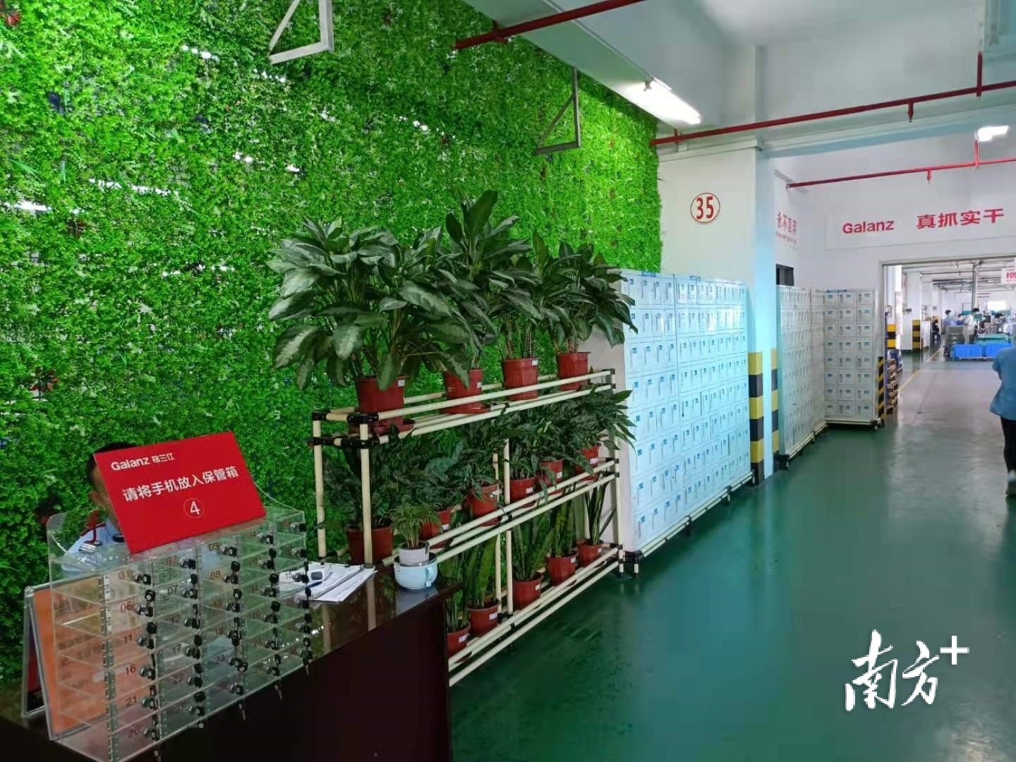 格兰仕元器件装配车间处处洋溢着绿意:工厂一面朝细滘河畔,一面朝顺德厂区大操场,露天平台栽种的花果与池塘景观相映成趣,楼层连接处的长廊摆满绿植。这里的每一盆绿植都有工厂员工认养,他们的名字就贴在花盆上。