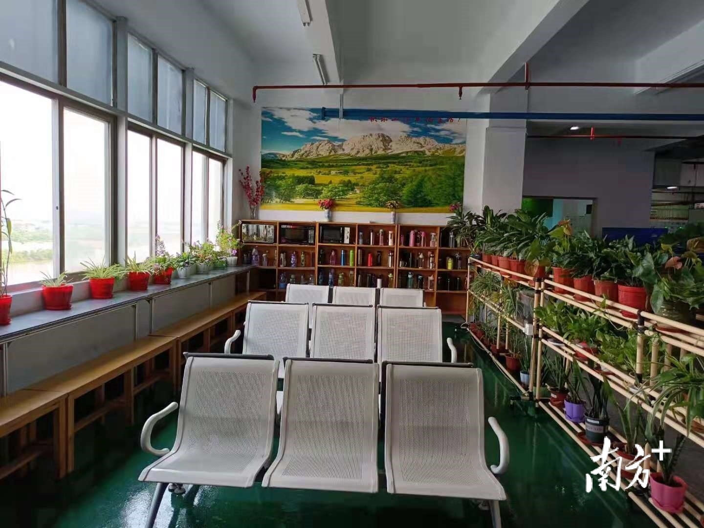 元器件车间在沿河的窗前、长廊、洗手间位置分别设休闲小区。每个休息区的标配是同款靠背凳和员工自制的花架。花草均由员工自带或认领,鱼缸里还养着小鱼。为方便休息和饮食,休息区摆放格兰仕自产微波炉、冰箱。打开冰箱,每层置物区都有号码贴纸,每个员工的饮品按编号区域整齐排列,有条不紊。