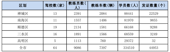 据统计,目前佛山共有驾培机构64家,其中禅城区13家,南海区11家,顺德区19家,高明区5家,三水区16家。