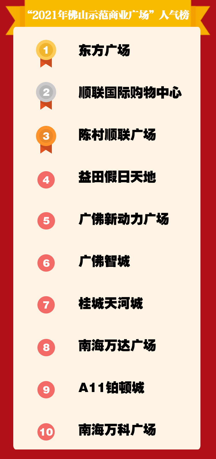 经过6天(9月14日至9月19日)数十万人次的网络点赞投票,“2021佛山示范商业广场”正式出炉,东方广场、顺联国际购物中心、陈村顺联广场、益田假日天地等10家商业广场票数居前,入选“2021年佛山示范商业广场”人气榜。