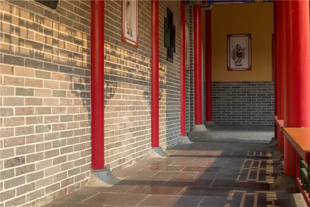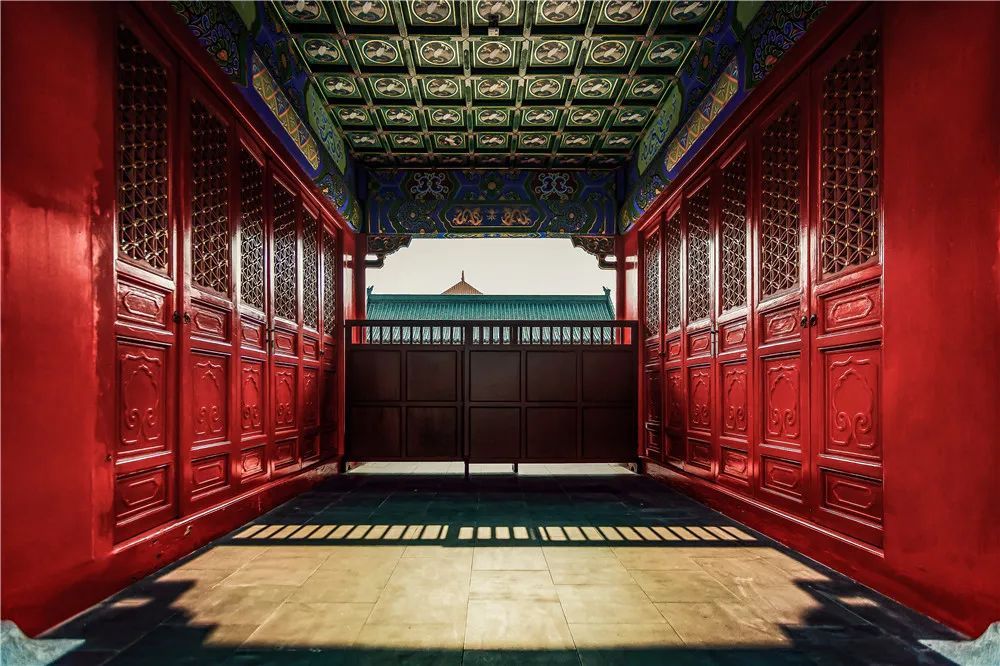 阳光透过淡淡的云层倾斜地照射到孔圣园的横梁雕花上,雕花披上阳光再映照在地上、墙上。