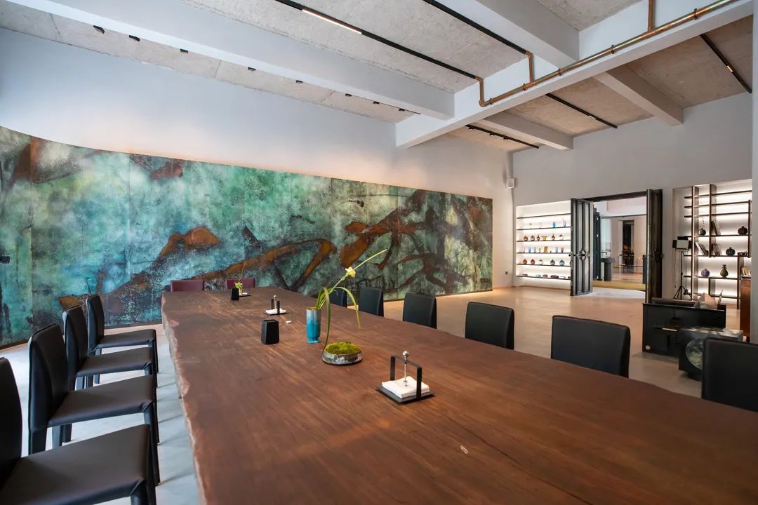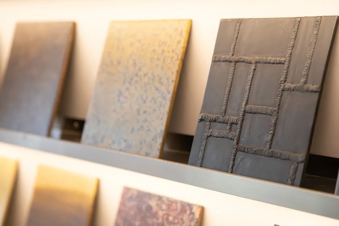 在样板墙前你能更直观地感受到铜是什么、铜能做什么,十余种表面处理技术,超200种稳定着色方案,为铜呈现各式各样的肌理和形态提供可能。