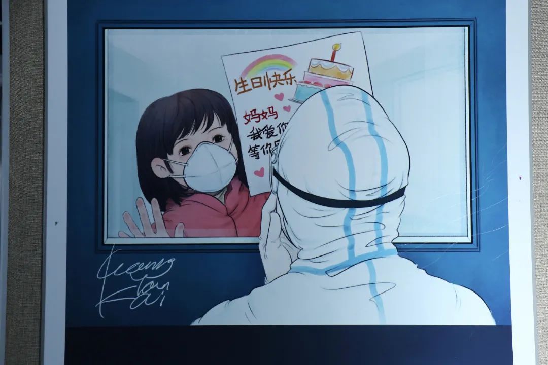 除了写实类的作品,这里也展出了多元化风格的抗疫插画,用可爱、有趣的笔触描绘中国的抗疫故事。