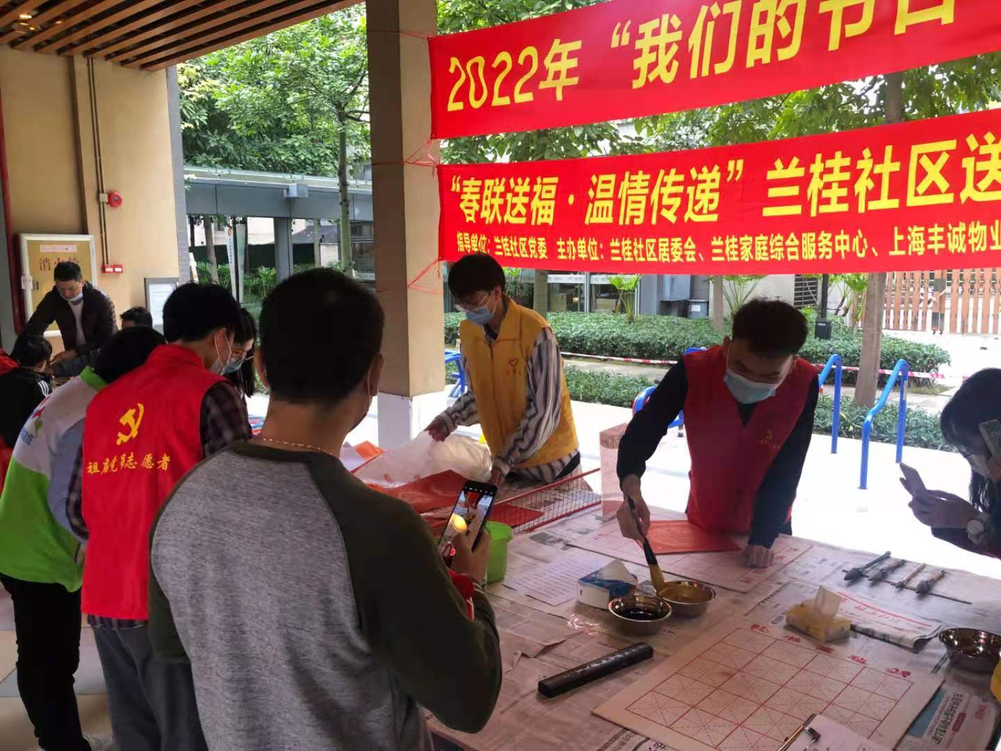春联送福,传递温馨。兰桂社区与丰诚物业在新春佳节来临之际,为小区居民免费写春联、赠春联,让居民感受浓浓年味,拉近彼此距离,营造文明、和谐、欢乐的节日气氛。
