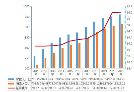 2021年,佛山常住人口增量占全省增量(60万)的比重为15.6%,为近十年来占比最高的年份,比2020年提高9.1个百分点。全市城镇人口915.22万人,城镇化率达95.21%,高出全省平均水平20.58个百分点。