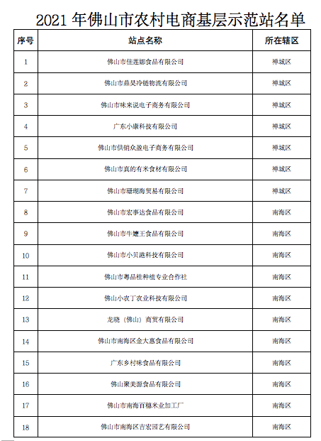 根据《佛山市人力资源和社会保障局关于开展农村电商基层示范站认定工作的通知》,农村电商基层示范站按照“好中选优、示范带动”的原则,从全市镇村(含涉农街道居委)农村电商站中扶持创建。原则上每个镇(含涉农街道)至少扶持建设1个,选点向行政村倾斜。