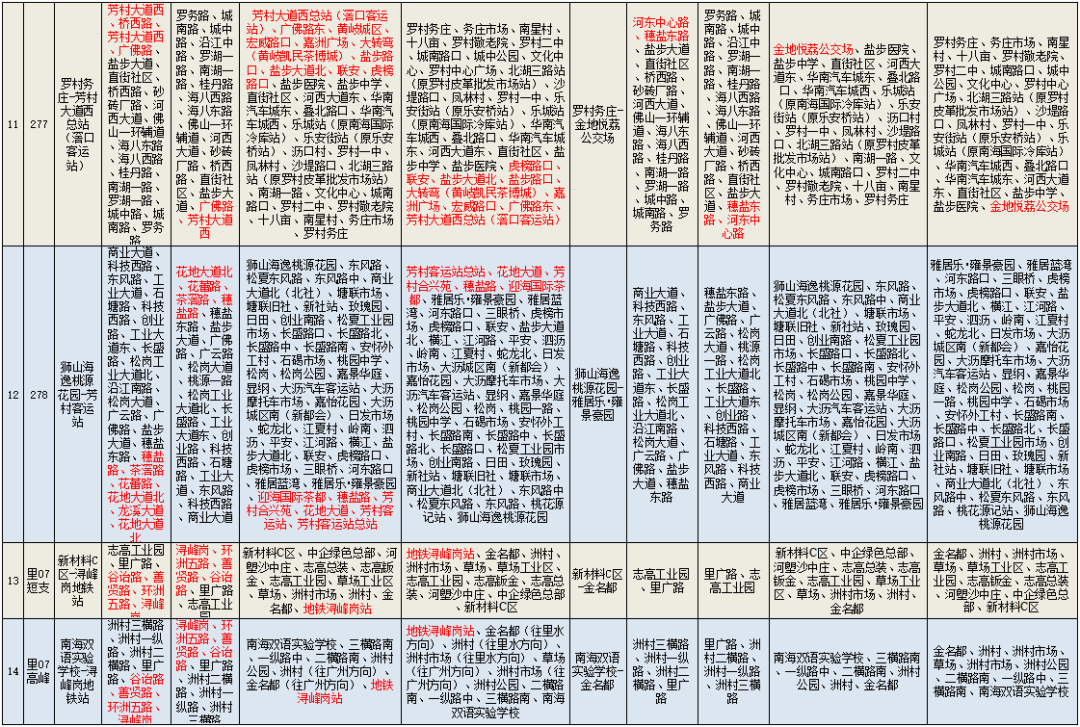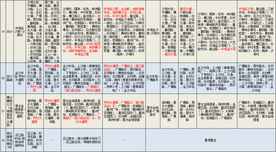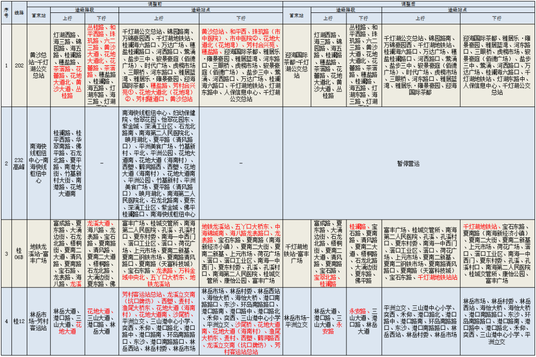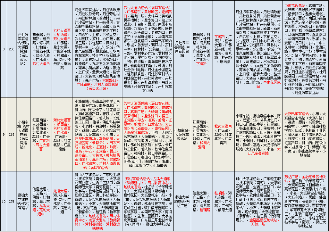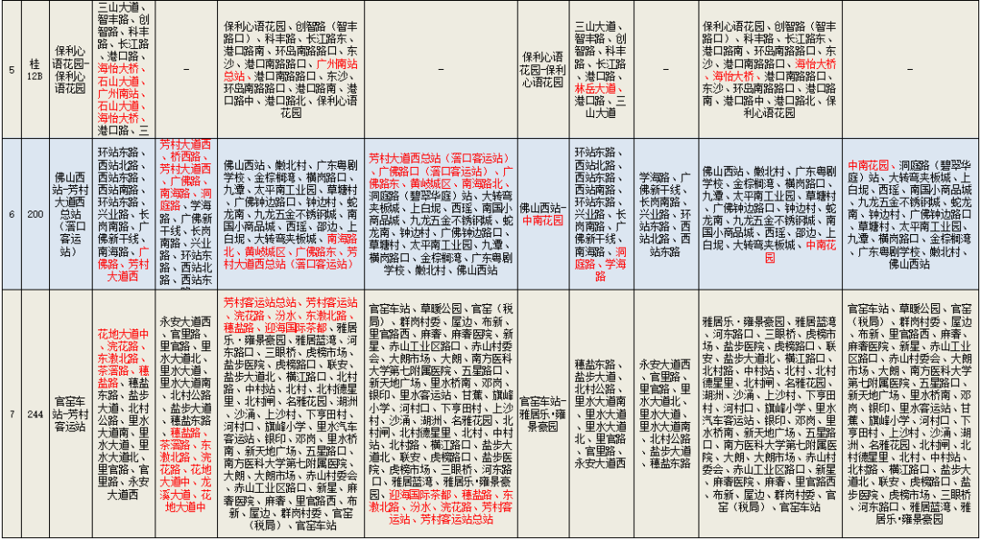 一、244线、278线截短至雅居乐•雍景豪园;里07短支线、里07高峰线截短至金名都;200、250截短至中南花园总站;里07B、252截短至中海金沙里;沥18、沥20截短至中海金沙湾;沥12高峰线、佛山辅助公交(金域缇香至芳村大道西)截短至广佛路东;202调整为迎海国际茶都-千灯湖公交总站;沥20高峰线调整为白塔村总站-浔峰岗地铁站;桂06B调整为千灯湖地铁站-富丰广场;桂12调整为林岳市场-平洲立交;桂12B取消停靠广州南站;263调整为小塘车站-大沥汽车客运站;275调整为狮山大学城总站-万达广场;277调整为罗村务庄-金地悦荔公交场。详见附表。